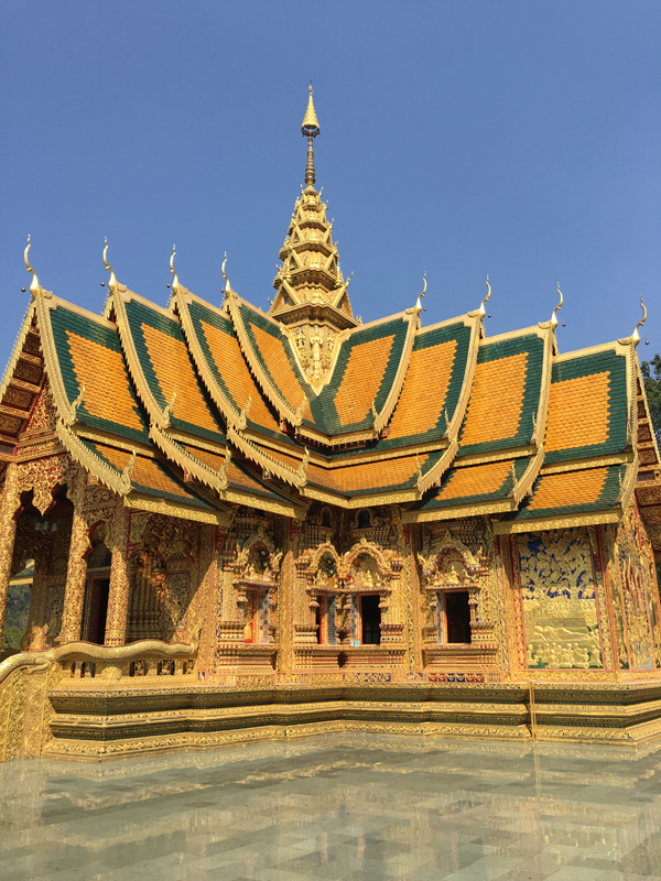 Wir arbeiten uns mühsam Kilometer für Kilometer durch enge Kurven und an ungeschützten Hängen entlang die Berge hoch. Obwohl wir erst 2 Stunden unterwegs waren, sind wir schon mürbe von der Schaukelei und den Serpentinen und brauchen bald wieder eine Pause. Mein Onkel Chai ermuntert uns durchzuhalten und verspricht uns, dass der Tempel Wat Pra Prabat Si Roy, den wir als nächstes Etappenziel ansteuern, ein Highlight unserer Reise sein wird. Der Tempel ist unter Thailändern wegen des vierfachen Buddha-Fußabdrucks bekannt und wird hochgeschätzt. Als wir Salouang erreichen, fahren wir schon bald durch eines der größten und prächtigsten Tempeltore, das ich jemals gesehen habe, auf einen Platz gewaltigen Ausmaßes. Da das Tor noch im Bau ist, werden wir uns später eine Illustration zeigen lassen, wie es mal aussehen soll.