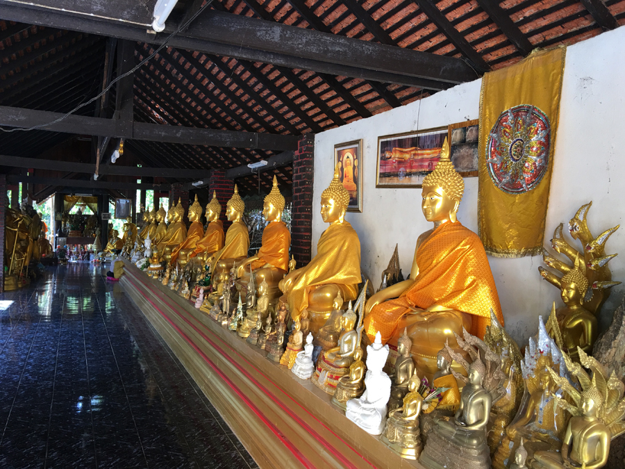 Mein Mann und ich decken uns an den Ständen auf dem gigantischen Parkplatz mit Blumen, Kerzen und Räucherstäbchen ein und steigen die Treppen zu dem am Berghang gelegenen Teil der Tempelanlage mit den Fußabdrücken hinauf. Die Bauarbeiter, die überall in diesem waldigen Areal an irgendwas zu werkeln scheinen, rufen uns zu, dass wir Glück haben, denn bis vor kurzem gab es keine Treppe, sondern man mußte eine Leiter hochsteigen. Wir erweisen den Fußabdrücken die Ehre, besichtigen auch noch kurz den benachbarten Dhevada Pavilion, der 28 Buddhastatuen beherbergt, haben aber jetzt schon nur noch Augen für den gegenüber jenseits des Hanges liegenden Tempelbau Pra Viharn Jaturamuk, dessen goldene Fassade in der Sonne glitzert und der auf einem glänzenden Marmorplateau ruht und uns magisch anzieht.