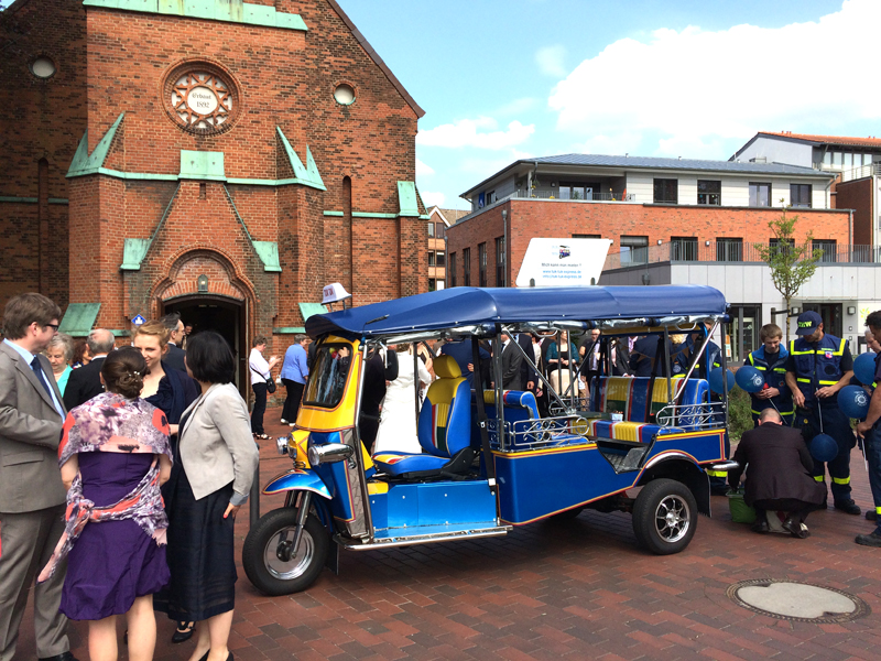 Wir sehen es als Glückszeichen an (und als Thailänderin bin ich ziemlich abergläubig), dass sich vor dem Weißen Tempel in Chiang Rai unsere Wege wieder mit ihrer Königlichen Hoheit Maha Chakri Sirindhorn, genannt Pratep, kreuzen. Leider konnten wir ihr nur zuwinken, als sie im Auto vorbeifuhr. Eine richtige Begegnung war das natürlich nicht. Aber eine Freude und eine Erinnerung an ihren Besuch an der Obertrave in Lübeck (vgl. FARANG 10-2013).