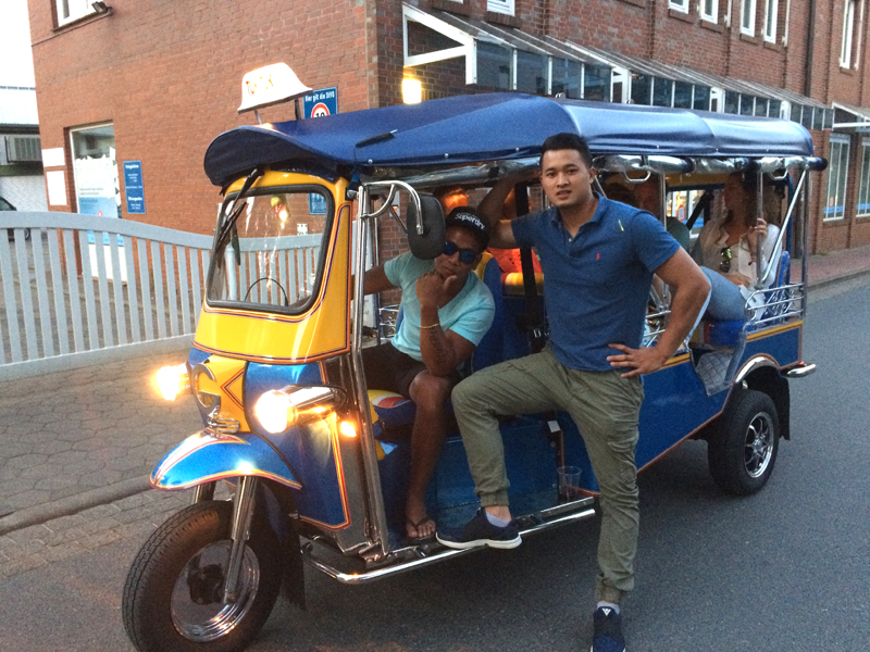 Wir sind nach der Führung durch unsere thailändischen Freunde, die Lehrer an dieser Akademie sind und die Direktorin Kruh ("Meisterin") Sohnatda Panchee vertreten, die auf Reisen ist, restlos begeistert und erschlagen von den Dimensionen. Mit den Lehrern Adul Sukrongchang und Nonglak Chaikhat, die auch schon in Deutschland im Rahmen der Sappaya-Ausbildungen der Thai Spa Vereinigung Deutschland e.V. viele Massagetrainings durchgeführt haben, verbindet uns aber noch mehr: Sie waren über eine Woche bei uns zu Hause in Lübeck unsere Gäste, als wir ein Inhouse-Training in unserem SU WANYO Thai Spa mit ihnen durchgeführt haben. Wir haben zusammen gegessen und Ausflüge gemacht und sind uns viel näher gekommen. Sie fragen uns, ob wir nach der Besichtigung Lust haben, ein für Thailand revolutionäres Gastronomiekonzept kennenzulernen und ihre Einladung zum Abendessen annehmen. Uns ist es etwas peinlich, weil wir mit der ganzen Familie unterwegs sind und ahnen, dass niemand von der Einladung ausgenommen wird. Das wird teuer für unsere Gastgeber.
