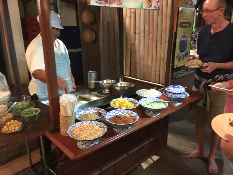 Ein wenig enttäuschend war das angebotene Dinner mit Tanzvorführung. Für jemanden, der noch nie thailändisch gegessen hat, war es sicherlich ein Erlebnis, ich fand es eher einem Touristengeschmack (was immer man darunter versteht) zu sehr angepaßt. Ich ließ darum das Buffet weitgehend unbeachtet und schwätzte ein wenig mit der Nudelsuppenfrau. Ihre Khao Soi, eine nördliche Nudelspezialität, war köstlich und verführte zu mehr als einem Teller, worüber sie sehr erfreut war. Die beste Khao Soi gibt es natürlich nur in Chiang Mai in dem kleinen Laden an der Ecke Huew Kaeo-Super Highway, aber die zweitbeste immerhin hier.