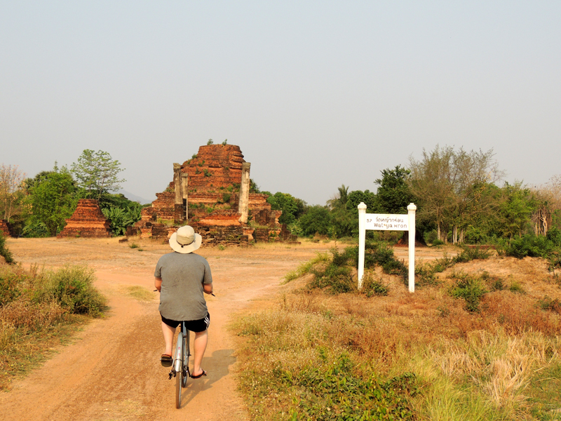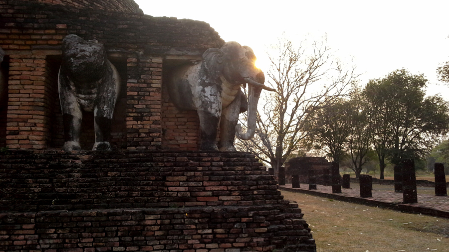Die heutige Stadt Sukhothai, früher Hauptstadt des gleichnamigen Königreiches vom 13. bis zum 15. Jahrhundert, liegt etwa auf halber Strecke der Reiseroute Bangkok-Chiang Mai. Die meisten Urlauber fliegen und wissen gar nicht, was sie dabei versäumen. Wir sind mit dem Tourbus gereist und hatten Sukhothai als Stopover zur Erholung gewählt, denn das Fahren auf den zugegebenermaßen sehr gut ausgebauten Straßen vom Süden in den Norden zieht sich hin.