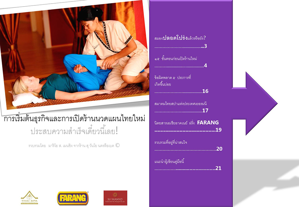 Auch das Berliner FARANG-Magazin will die Weiterbildung von Thai Massagen unterstützen. In der nächsten Ausgabe bringen wir einen Artikel zur Betriebsführung (Finanzen und Steuern) in der Thai Massage. Außerdem haben wir die Erstellung des Leitfadens "Existenzgründung in der Thai Massage" unterstützt, der kostenlos in deutscher und thailändischer Sprache beim Autor per E-Mail angefordert werden kann: Info@wanyo.de Mario Mensing