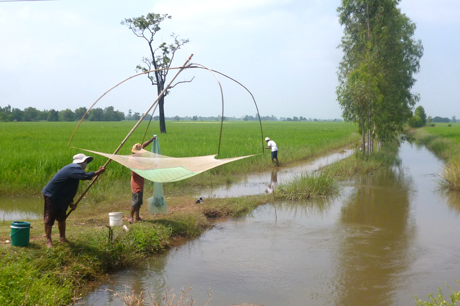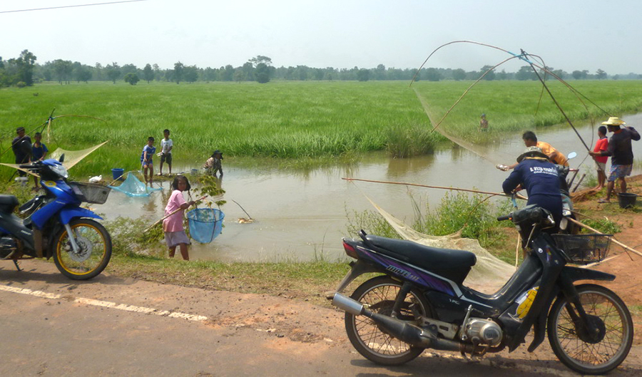 Während im Süden des Landes um diese Jahreszeit noch mit heftigen Regenfällen zu rechnen ist, ist im Isaan die Regenzeit vorbei. Wasser läuft von den Feldern und die Reisernte wird bald beginnen. In den ersten Wochen der Regenzeit wandern viele Fische stromaufwärts, um in den überfluteten Gebieten ihre Eier abzulegen. Jetzt schwimmen sie zurück. Mit Speer, Kopflampe und Netz bewaffnet stellen ihnen nachts nun Einheimische nach. Am Tage sind eher die kleinen Fische unterwegs. Sie werden mit Netz und Reuse an Wasserläufen und Brücken gefangen. In Thailand wird bekanntlich so gut wie alles Essbare verwertet.