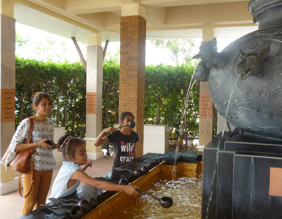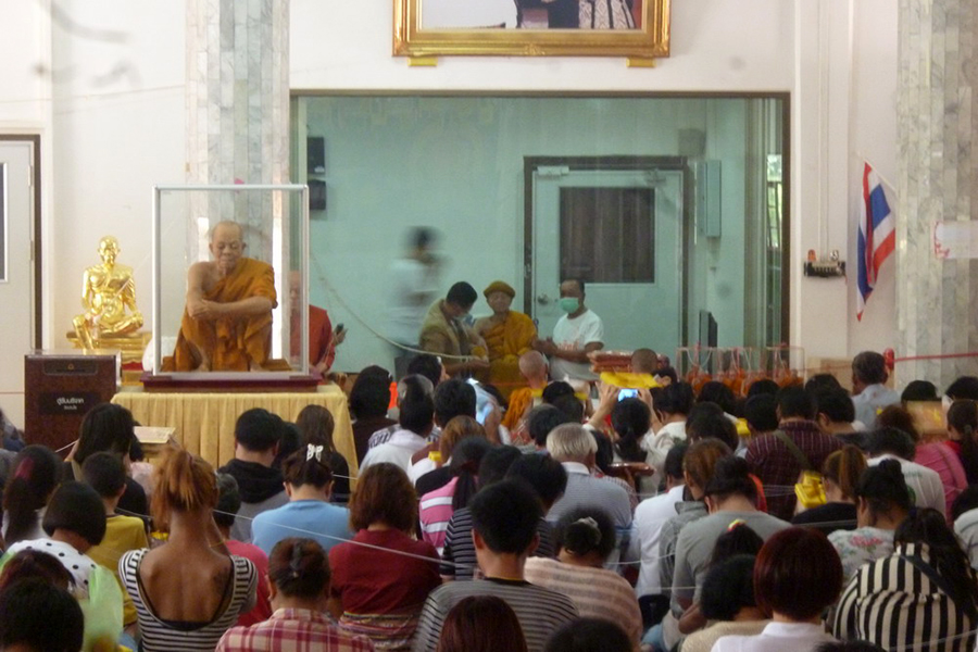 Am Tempeleingang waren einige Verkaufsstände aufgebaut. Händler verkauften Blumen fürs Gebet, Geschenkpakete für die Mönche und Esswaren und Getränke. Einer bot lebende Vögel, Schildkröten und Fische an. Es soll Glück bringen, wenn man sie kauft und anschliessend freilässt. Die Tempelanlage befindet sich an einem künstlich angelegten See. Ein Kunstwerk besonderer Schönheit ist ein riesengroßer Elefant, der eigentlich ein Gebäude mit mehreren Etagen ist. Innen und außen kann man Gemälde und Kunstwerke bewundern. Im eigentlichen Tempel Wat Ban Rai sahen wir den ehrwürdigen Mönch Luang Phon Koon. Er saß in einem Rollstuhl, umgeben von Ärzten und Krankenschwestern, hinter einer Glaswand und war gebrechlich und krank. So richtig reden konnte er auch nicht. Aber die vielen Gläubigen, die eigens zu diesem Ereignis kamen, waren glücklich und dankbar ihn zu sehen.