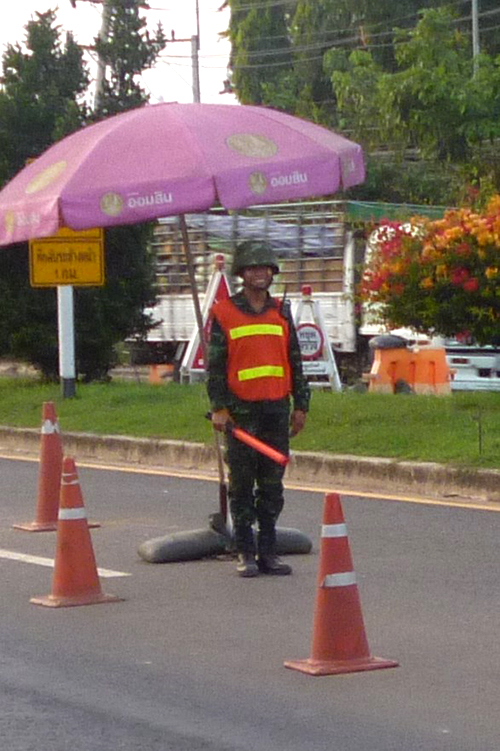 Fast 100 Kilometer braucht man um aus Bankoks Großstadtgetümmel heraus zu kommen. Wir passierten einige Polizei- aber auch Militär-Straßensperren. Bevor wir in die Landschaft des Isaans mit seinen grünen Reisfeldern gelangten passierten wir das Kao Yai-Gebirge.