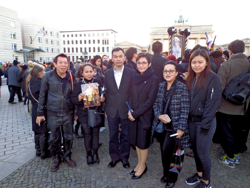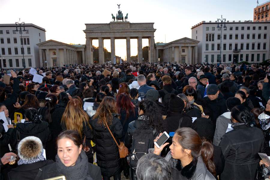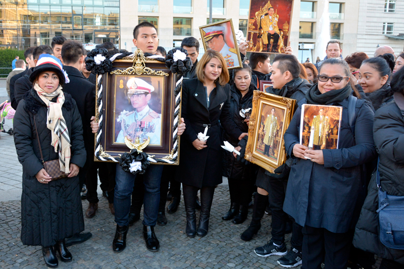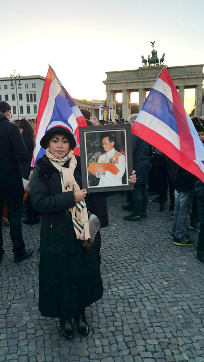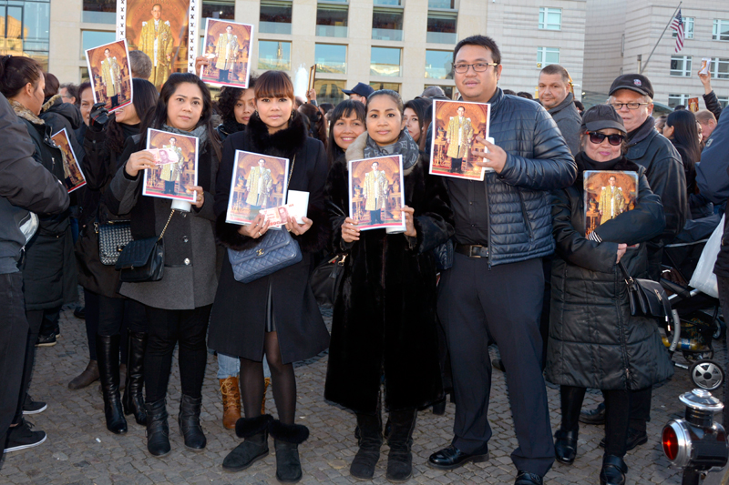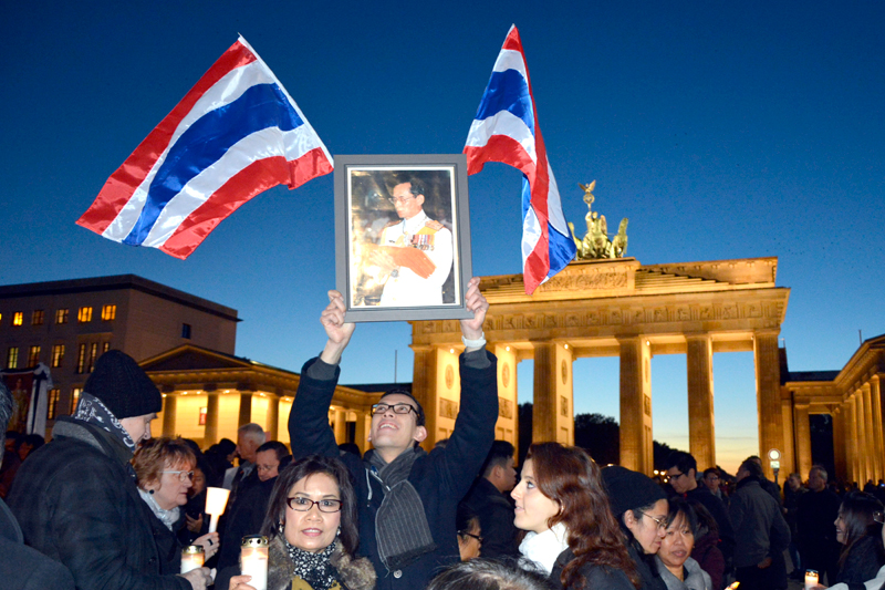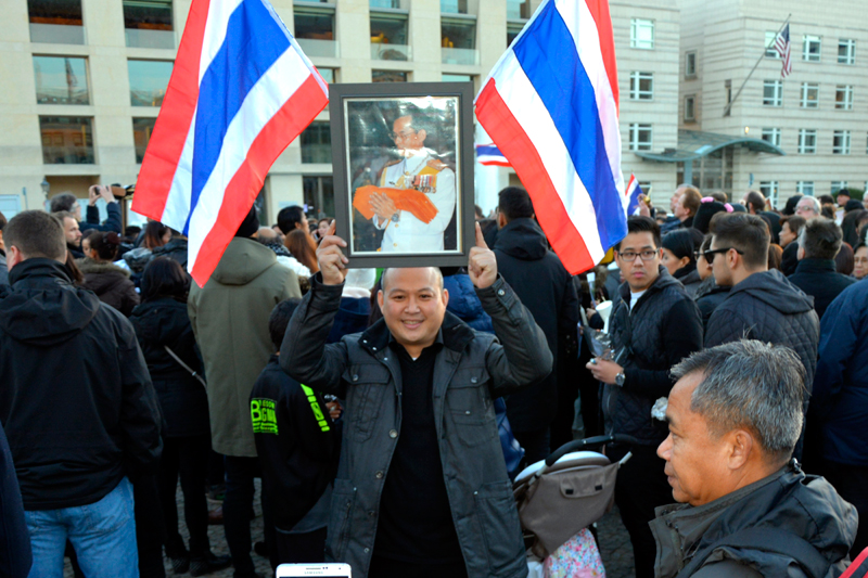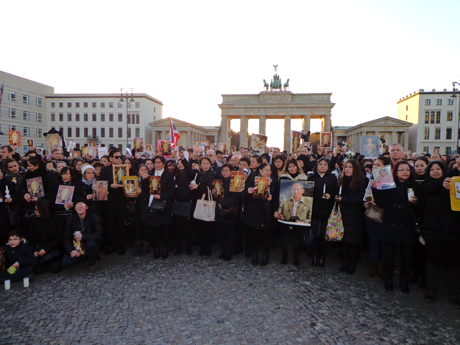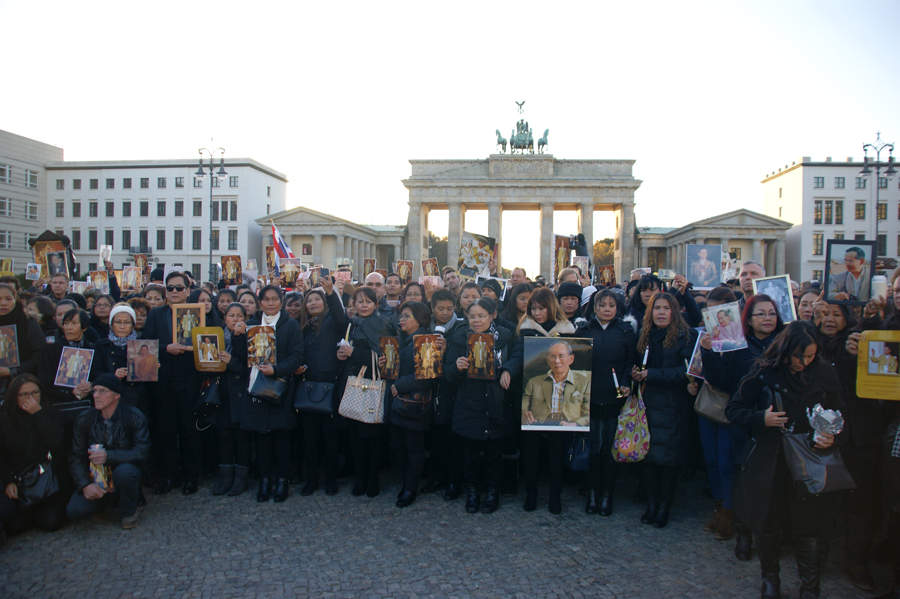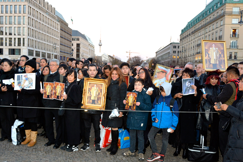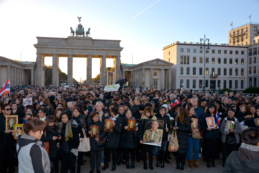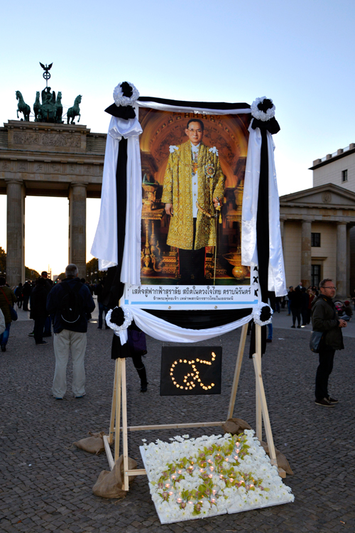 Am 30.10.2016 kamen rund 2.000 Menschen wie in Deutschland lebende Thailänder und Deutsche am Brandenburger Tor zusammen, um in Gedenken an Seine Majestät König Bhumibol Adulyadej die letzte Ehre zu erweisen.