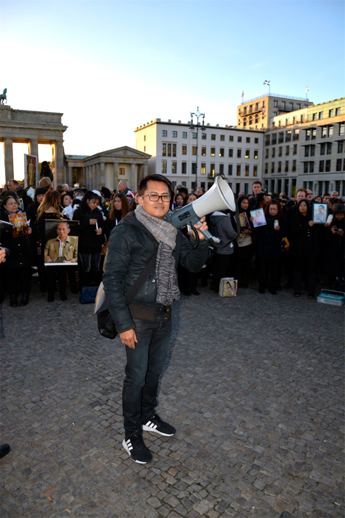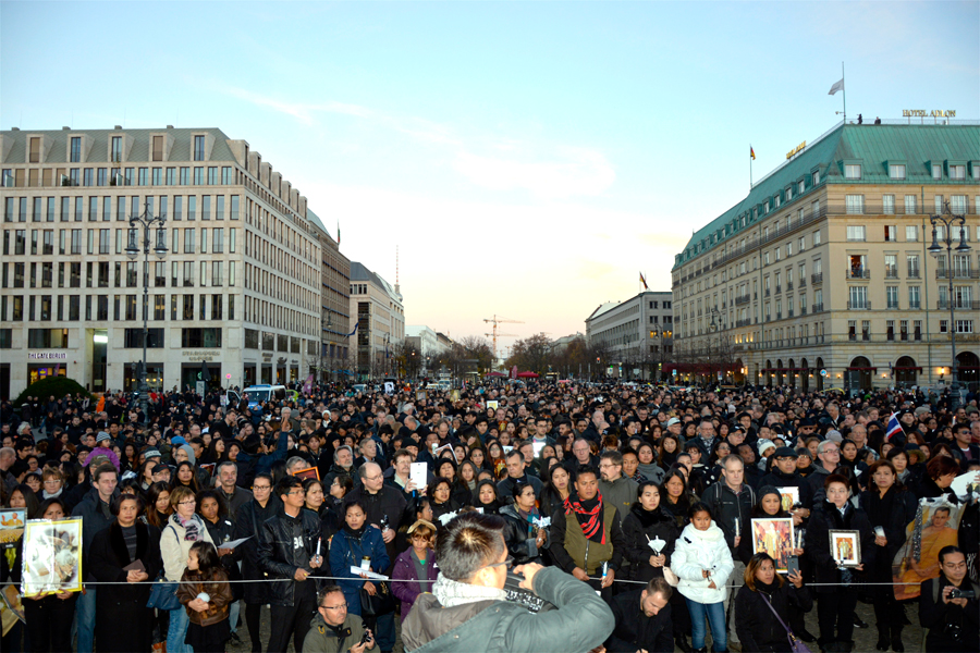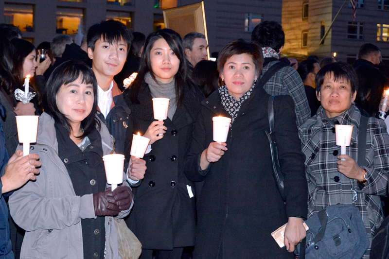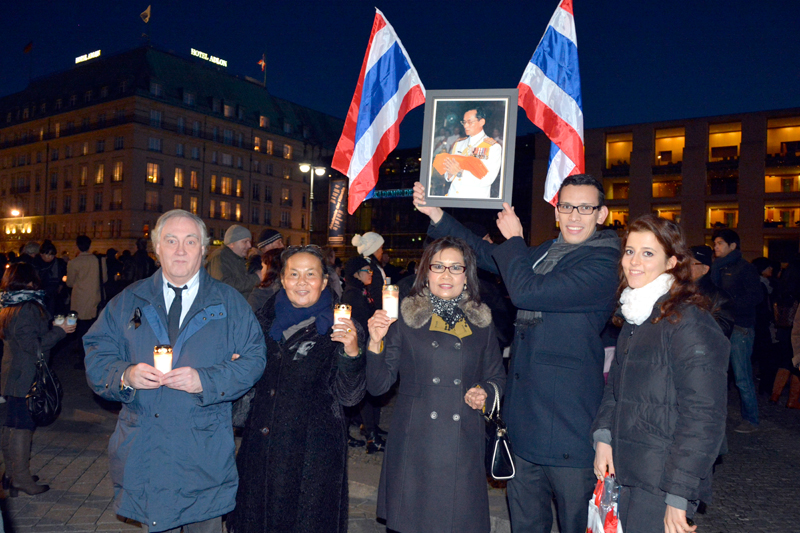 Zu diesem Anlass zünden die schwarz gekleideten Teilnehmer Kerzen an und sangen gemeinsam zur Huldigung Seiner Majestät die Hymne zur Lobpreisung des Königs - Sansoen Phra Barami. Anwesend waren auch Frau Aurapin Leelittham als Vertretung des Botschafters, Diplomaten sowie Angestellte der Thailändischen Botschaft. Die Teilnehmer kamen aus ganz Deutschland, auch ein Fernbus aus der Schweiz war eingetroffen. Viele hatten Thaifahnen und Bildnisse des Königs mitgebracht. Das nahe Hotel Adlon hatte sogar die Thaifahne auf Halbmast gestellt. Es war eine sehr ergreifende und innige Stimmung am Brandenburger Tor.