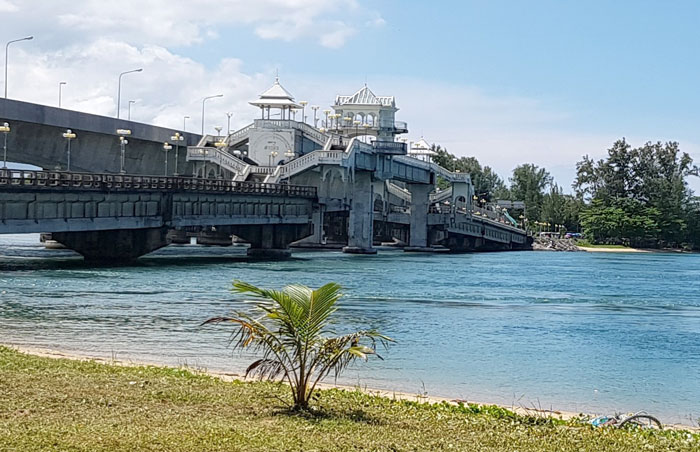 Nach einigen Kilometern machte ich bei einer großen Brücke einen kurzen Stopp, um ein Foto von diesem schönen Bauwerk zu machen. Diese Brücke verbindet die Insel Phuket über eine Meerenge mit dem Festland und wurde nach einem chinesischen Kaufmann namens Sarasin benannt. "Die Brücke hat eine traurige Geschichte", erklärte uns Weau: "Hier gab es einmal ein Liebespaar. Der Jüngling, ein Sohn eines wohlhabenden Kaufmannes liebte eine arme Bauerntochter. Der Vater verbot diese Beziehung. Eines Nachts stürzten sich die beiden an dieser Stelle in den Tod. Aus Trauer ließ der Vater diese pompöses Brücke errichten." Besonders abends ist ein Ausflug dorthin empfehlenswert. Angler werfen ihre Ruten aus, Verkäufer öffnen Verkaufsstände und bei angenehmen Meeresbriesen kann man einen romantischen Sonnenuntergang erleben.