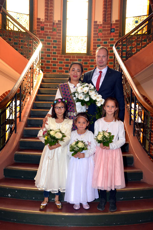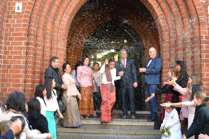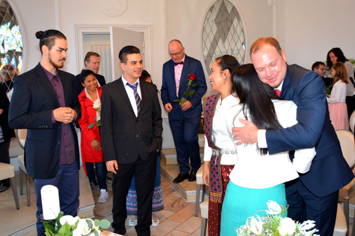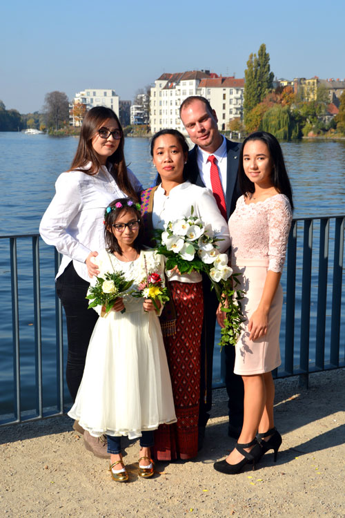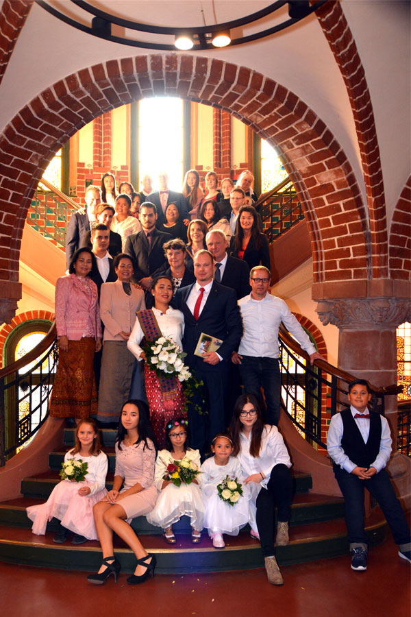 Unter den Hochzeitgästen waren Mama Thongbai Kanonsri, Mama Waree Thongbang, Töchter Laetitia, Lisa, Isabel Maya, Andrés Eltern Jürgen und Marina Koch, seine Schwester Josefine und die beiden Brüder Michael und Maximilian Stahnke sowie Bekannte, Kollegen & Freunde. Nach der Trauung wurde im Ratskeller auf das Glück angestoßen, Glückwünsche entgegengebracht und Töchterchen Isabel hatte ihr eigenes Gedicht Lin & André geschrieben und verlas es in aller Öffentlichkeit. Beide waren gerührt von den lieben Worten und drückten ihre Kleine ganz fest. Gemeinsam begab sich die Hochzeitsgesellschaft gegen 14 Uhr in das griechische Restaurant ASTERIA in Köpenick um zu speisen und mit dem frisch gebackenen Brautpaar ausgiebig zu feiern.