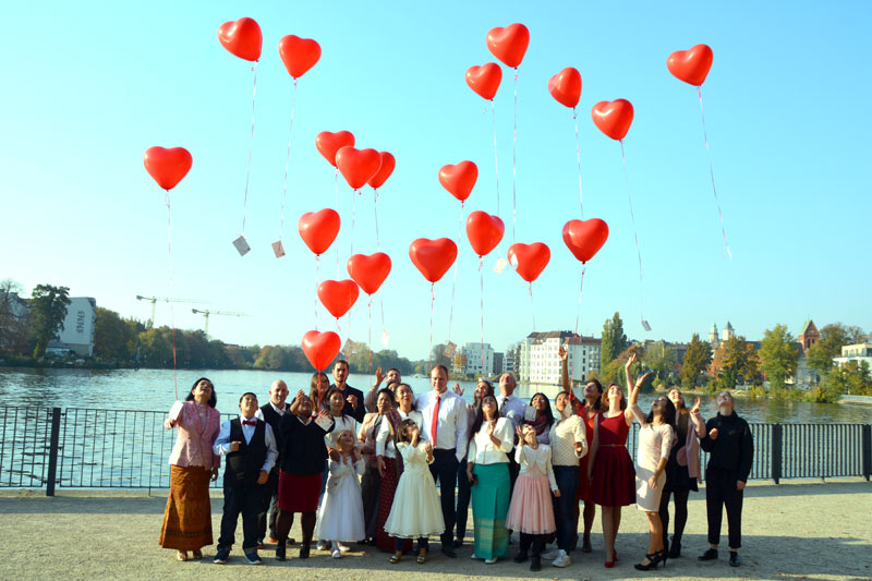 Mit Helium gefühlte Herz-Ballons wurden mit einer Glückwunschkarte für das Brautpaar auf Reisen geschickt, um aus aller Welt Post zu bekommen. Wir vom FARANG wünschen den beiden nur das Beste und geben einen ganz kleinen lieb gemeinten Rat: Nicht immer scheint die Sonne, es gibt auch mal Regen, manchmal sogar Gewitter, doch glaubt mir, die Sonne hat die Kraft und bricht durch die dicksten Wolken. In diesem Sinne nochmals alles Gute und viel Glück! Peter Phetkhieo