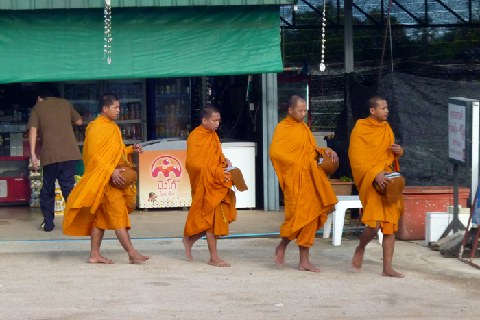 Wie überall in Thailand gibt es auch hier viele Tempel. Morgens verlassen die Mönche die Wats um Speisen zu "erbetteln". Wer früh aufsteht, kann ihnen dabei zusehen. Die Einheimischen spenden sie gerne. Sie glauben, wenn sie den Mönchen Essen geben, erwerben sie einen hohen Verdienst im Buddhismus. Sie bitten, die angebotene Speise anzunehmen, um dafür Segen zu erhalten. Somit ist es eigentlich kein Betteln, sondern eine Entgegennahme von Opfergaben. Die Mönche leben ausschließlich davon. Sie haben sich einem Leben ohne materiellen Besitz in Armut und Gebet verschrieben.