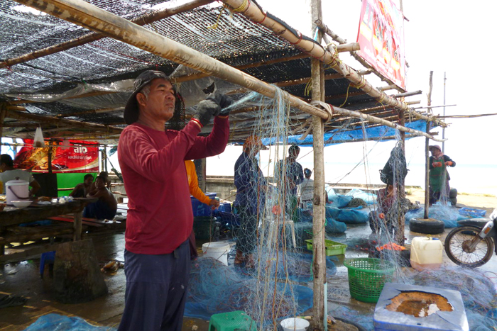 Inklusive der verspäteten Abreise, Shopping-Pause und Grenzfahrt kamen wir nach 9 Stunden am Chao Lao Beach am Golf von Thailand an. Wir gingen in einem Strandlokal essen und erlebten einen schönen Sonnenuntergang. Für die erste Nacht mieteten wir uns in einer preiswerten Bungalowanlage an der Küstenstraße ein. Weil es aber bis zum Strand einige 100 Meter waren zogen wir am nächsten Tag in ein Resort direkt am Meer. Dort war es etwas teurer, aber schöner und wir konnten öfters baden gehen. Der Nichte brachte ich in wenigen Tagen das Schwimmen bei. Bei Schwägerin Wän klappte es nicht so gut. Sie hatte Angst, dass sich ihre in ihrem Friseursalon über jahrelange Innenarbeit erworbene hellere Haut wieder dunkel färben würde. Deshalb ging sie nur morgens oder abends ins Wasser. Helle Hautfarbe ist schick in Thailand. Dunkelhäutige gelten als arme und ungebildete Menschen, die bestenfalls als Bauarbeiter oder auf den sonnigen Reisfeldern arbeiten.