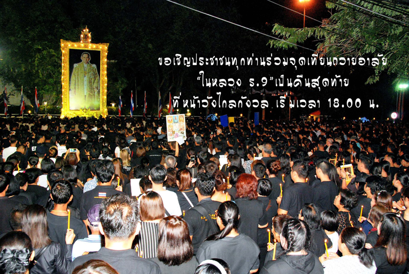 An jenem Tag wurde in Bangkok in dem eigens neu errichteten königlichen Krematorium die Einäscherung nach sehr alter Tradition vollzogen. Die Hauptstadt war im Ausnahmezustand, das ganze Land in kollektiver Trauer befangen. Hunderttausende Trauernde hatten sich in Bangkok eingefunden, zigtausende Polizisten und Soldaten hatten erfolgreich für Sicherheit gesorgt. Die Zeremonie im Ort der Sommerresidenz der königlichen Familie war sehr festlich, würdevoll und dem Anlass sehr angemessen. M.H.