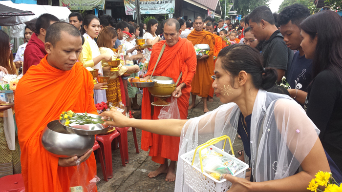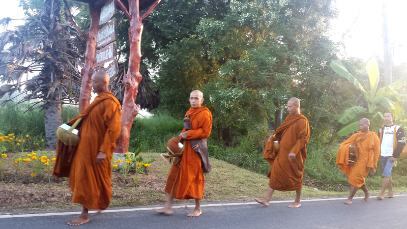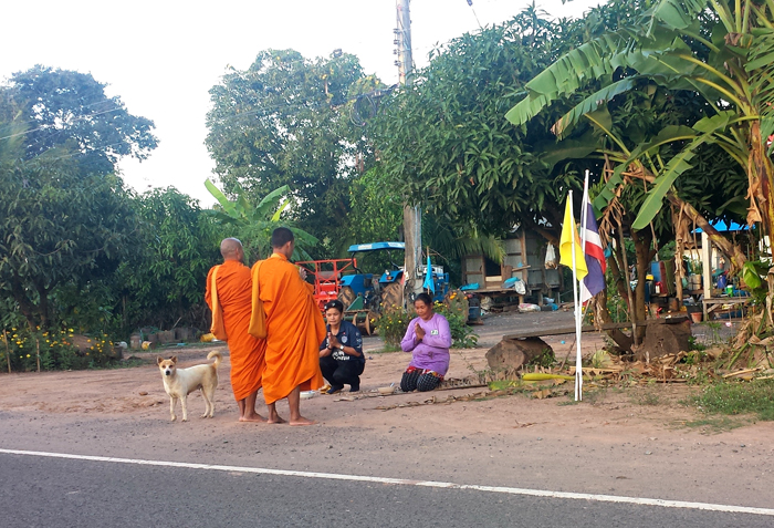 Wenn man so früh in Thailand unterwegs ist, hat man das Glück, den Einheimischen zuzusehen wie sie den Mönchen dankbar Essen und andere Gaben spenden. Den ersten Stopp machten wir am Badesee bei Nong Ki. Meine Damen bestellten Reissuppe zum Frühstück und ich ging schwimmen. So richtig schön war es aber nicht. Anwohner verbrannten ihren Müll und Giftwolken waberten über den See. Danach fuhr Weau das Auto und ich machte den Navigator.