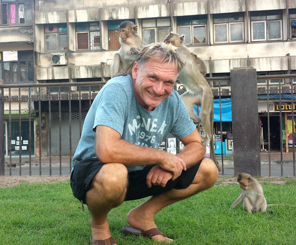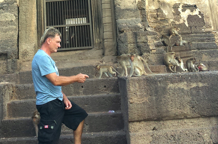 Verärgert gingen wir zur Tempelanlage zurück und sahen, wie die Affen dasselbe Spielchen an einem roten Honda trieben. Am Tempeleingang wurde Eintritt kassiert und ich als Farang durfte wieder einmal ein Vielfaches an Eintrittsgeld als die Thais blechen. In der Tempelanlage wurde es dann richtig nervig: Von allen Seiten sprangen mich Affen an. Ehe ich mich versah waren sie an und auf mir und wühlten mit ihren Pfoten in sämtlichen Öffnungen meiner Kleidung. Vergebens versuchte ich die Viecher abzuwehren. Einem gelang es, meine Brieftasche zu entwenden. Freudig kreischend rannte er mit seiner Beute davon. Ich war entsetzt, vermutete ich, dass eine kriminelle Bande dahintersteckt, die in einem schwarzen Auto wartet und dann, wenn der Affe kommt, mit meiner Brieftasche davonbraust. Dem war zum Glück nicht so: In einiger Entfernung untersuchte das Biest mein Portemonnaie und warf Geld, Kreditkarten, Ausweise und alles, was sich noch darin befand, nacheinander auf den Boden. Als ich mich dem Tier näherte, fauchte es mich an und rannte mit meiner Brieftasche weiter. Schnell sammelten wir die herausgeworfenen Wertsachen ein, aber die Brieftasche warf der Affe nicht weg. Einem Thailänder war kurz zuvor ähnliches passiert. Dem hatte ein Affe die Mütze geklaut. Erst als der Thai mit einer Banane winkte gab der Affe die Mütze zurück. Auch mit einer Banane kam mir der Mann nun zu Hilfe: und tatsächlich, der Affe nahm die Banane und warf meine Brieftasche weg. Schnell nahm ich sie auf, aber nach so vielen nervenaufreibenden Erlebnissen, hatte ich nun keine Lust mehr auf weitere "Tempelei". Ich wollte einfach nur noch raus aus dieser Affenstadt.