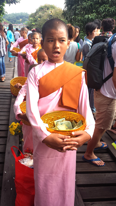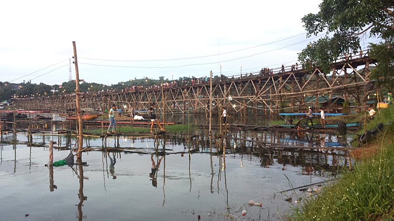 Wir sollten für diese Entscheidung belohnt werden. Bei einem grandiosen Sonnenaufgang über dem von Bergen eingerahmten See stellten wir fest, dass wir uns mit unserem romantischen Floßhaus ganz nahe an der berühmten Wooden Mon Bridge befanden. Mit ihren rund 850 Metern ist sie die längste Holz- Brücke des Landes und die zweitlängste der Welt. Um den Handel zwischen Thais und Bergstämmen zu ermöglichen, wurde sie im Jahr 1980 erbaut. Für Fahrzeuge ist sie gesperrt. Im Jahre 2013 war sie nach schweren Regenfällen zusammengebrochen. Unsere Vermieter empfahlen über die Brücke zu gehen, um den morgendlichen Gang der Bettelmönche beizuwohnen. Sie gaben uns landestypische Kleidung zum Anziehen und Geschenke für die Mönche und wir gingen rüber. Vor Kleider- und Souvenirshops hatte man Stühle aufgereiht, auf denen bereits viele Gläubige mit Geschenken saßen. Die Mönche kamen auch bald und nahmen Unmengen an Spenden in Empfang. "Was die damit wohl machen", fragte ich mich. In den Souvenirläden gingen meine Damen, recht preiswert shoppen und dann spazierten wir über die berühmte Brücke zurück. Dabei genossen wir die malerische Landschaft und beobachteten, wie Kinder von der hohen Brücke in den Stausee sprangen.