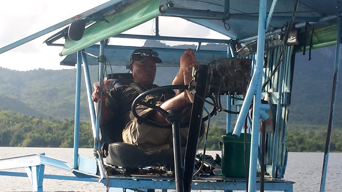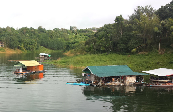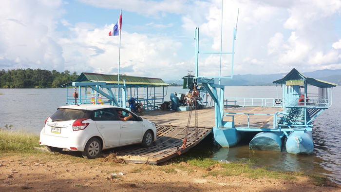 Auf einem Werbeplakat stand nebst Telefonnummer: "Übernachten sie auf unserer Insel in schwimmenden Bungalows! Rufen sie an! Wir holen sie ab". Sollten wir dort die Nacht verbringen? Aber wir hatten doch noch einige Stunden Zeit. Ich schaute noch ein Mal über den riesigen See und sah in weiter Ferne ein schwimmendes Etwas mit einer Rauchfahne. Und dieses Etwas kam langsam näher. "Dies könnte eine Fähre sein", mutmaßte ich. Es war eine. Aber was für eine? Es war eher ein Floß mit einem Dieselmotor, an dem eine Schiffsschraube montiert war. Als Tank diente ein Ölfass. Darüber befand sich, in etwa zwei Metern Höhe, ein Lenkrad und ein überdachter Sessel, auf dem der Fährmann saß. Aber es schwamm und als es anlegte fuhren zwei Autos runter. Wir fragten den Fährmann ob er uns übersetzt: "Eine Fahrt dauert 45 Minuten und kostet 300 Baht", sagte er. "Wenn wir aber auf ein weiteres Auto warten, dann zahlt jedes Auto nur 200 Baht." Ich hatte nicht viel Hoffnung, dass in dieser einsamen Gegend noch ein weiteres Auto dazukommt und entschied mich für die 300 Baht. Wir fuhren auf die Fähre und ab ging die Fahrt. Der Fährmann lümmelte sich in seinen Sessel und legte seine Beine aufs Lenkrad. Auf der Überfahrt wehte eine angenehme Brise.