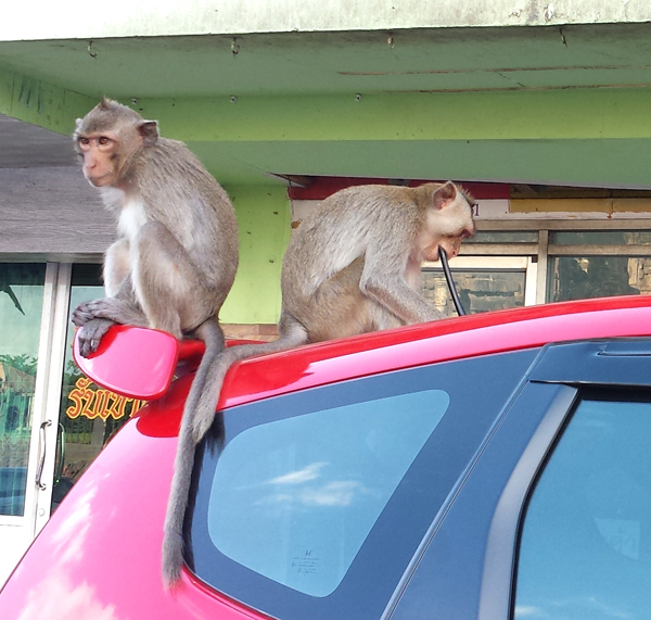 Wir wollten diesen Tempel als erstes besuchen und fuhren hin. Schon bald erfreuten wir uns über den Anblick frei herumlaufender Affen. Direkt neben dem Tempel fanden wir einen Parkplatz. Ich war überrascht, dass dort kein weiteres Auto stand. Wir stiegen aus. Es sah lustig aus wie die Affen gleich auf unser Auto sprangen. Als einer aber versuchte, die Antenne zu zerbeißen und ein anderer einen Gummi aus der Dachreling riss und mit diesem in Richtung Tempel verschwand, fand ich die Angelegenheit aber nicht mehr so lustig. Schnell stieg ich ins Auto und parkte es in einigen hundert Metern Entfernung.