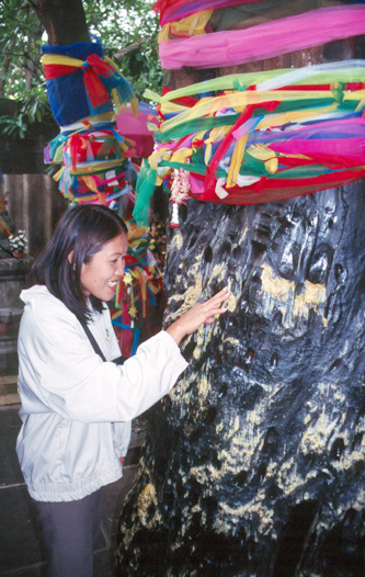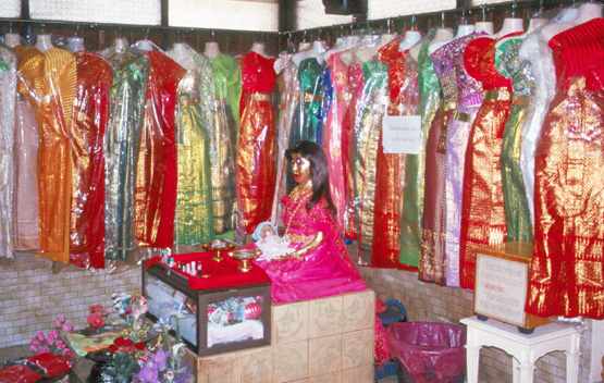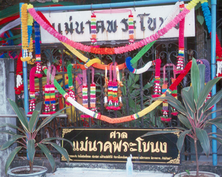Hier befindet sich der Geister-Schrein von Nang Nak. Täglich pilgern die Thai hierher, um ihr und ihrem totgeborenen Sohn ihre Aufwartung zu machen und Gaben zu spenden (schöne Kleider und Kosmetika für sie, Spielzeug für den Sohn etc.). Ich reichte die üblichen Gaben in Form von Räucherstäbchen, Blumengirlanden und Blattgold dar.