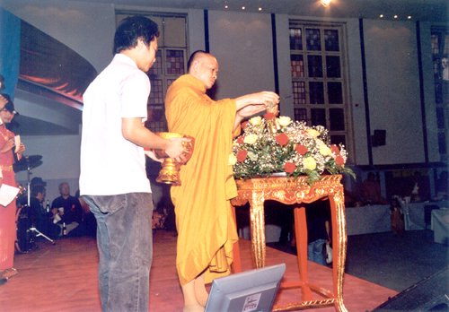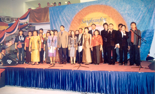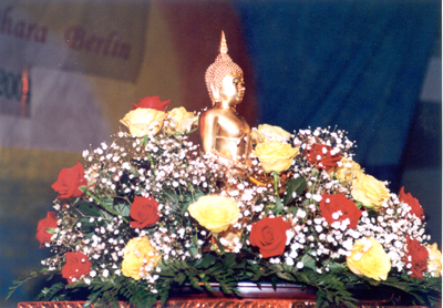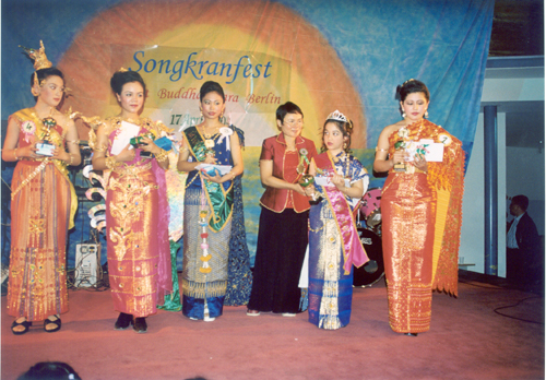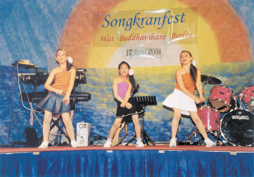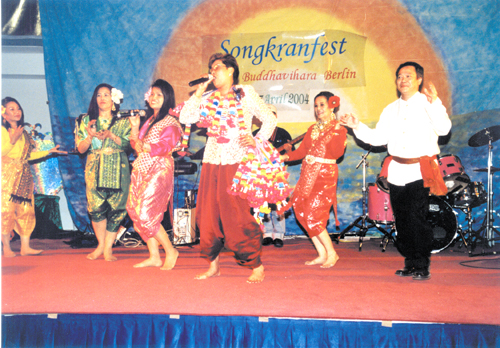 Am 17. April 2004 veranstaltete der Wat Buddhavihara seine Songkran-Feier (auch das Wasser-Fest genannt) in der Alten TU-Mensa an der Berliner Hardenbergstraße. Damit feierten die Buddhisten ihr Thailändisches Neujahr. Wie stets mit dem gemeinsamen Singen des Königsliedes beginnend, dann folgte die Wahl der Miss Songkran und eine prächtige Bühnenshow. Eine Tombola, viel Speis und Trank gehörten auch dazu. Wanwisa und Neng moderierten den Abend in schicken Kostümen souverän. Die zahlreichen Spenden kamen dem Tempel zugute. Obgleich nicht jeder Farang so glücklich war mit dem Programm, mehrere Hundert Thais waren sehr vergnügt.