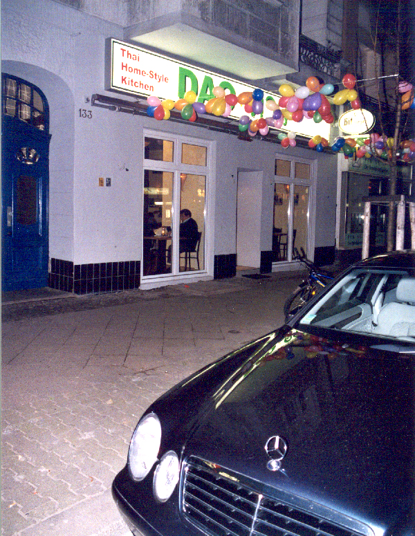 Das DAO ist schon etwas Besonderes: So etwa ein Zwitter zwischen großem Imbiss und kleinem Restaurant, wie Thomas Zimmermann von DAOs Asia Shop sagte. Alle Preise unter 10 Euro. So ist die Ente für 8,90 zu haben. Zur Eröffung kamen der Zweite Botschafter Thailands mit dem Militär-Attachee nebst Gattinnen. Auch Werner vom SFB (jetzt RBB), ein Team vom TAR, Frankie, Andy, Peter und Joy sowie Jeab vom K-15. Selbst einige Promis vom Film waren da. Jum bedient nun von 11 bis 02.00 Uhr. M.H.