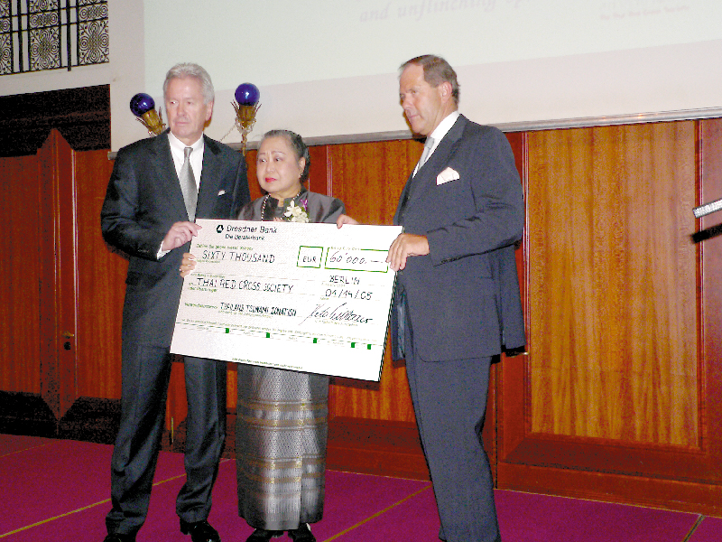 Am 14. Januar 2005 fand im Hotel ADLON ein Charity Cocktail statt. Reto Wittwer, Chef der Kempinski Gruppe, übergab an Botschafterin Cholchineepan Chiranond einen Scheck über 60.000 Euro für die Opfer der Tsunami-Katastrophe in Thailand. Ihre Exzellenz, die Botschafterin, war bei dem feierlichen Anlass sehr den Tränen nah. Thai International übergab eine weitere beachtliche Spende. Für Nalee und Ronald (Berliner Djantschai-Thai-Massage) war es ein Bedürfnis, ihre Spende persönlich zu übergeben.
