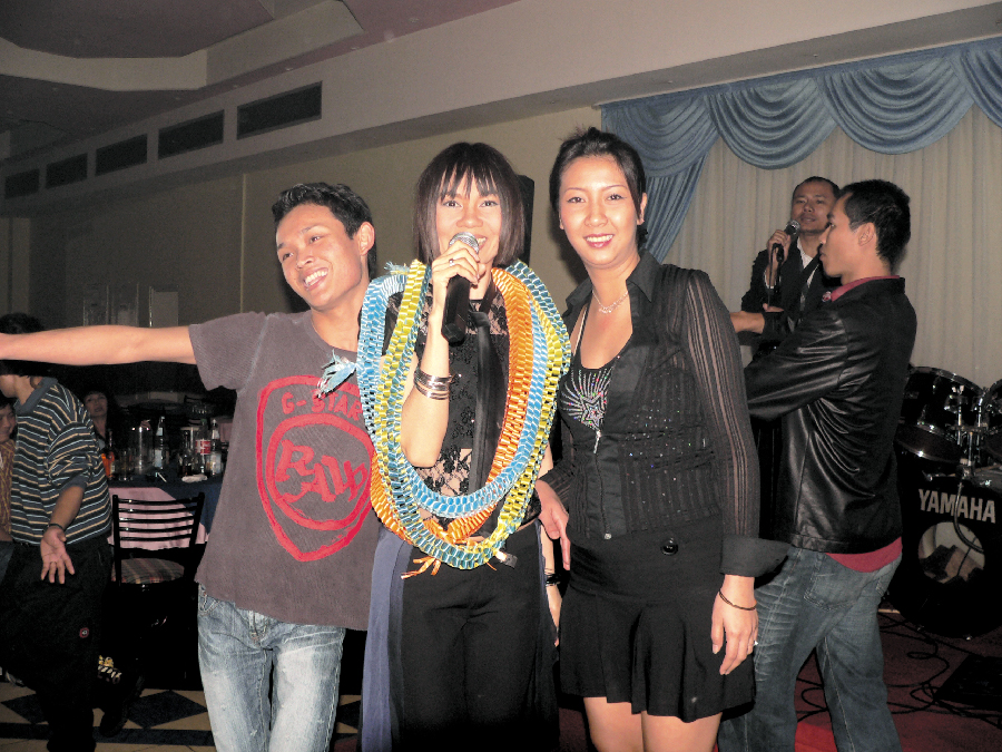 Zurück zum Abend. So etwa ab 20 Uhr kamen in kurzen Abständen die Jintara-Fans und waren froh, sich noch einen freien Tisch mit guter Aussicht auf die Bühne aussuchen zu können. Und es wurde voller und voller. Zur Eröffnung des Spektakels zunächst Live-Musik von der THAI THEK-Band, bestehend aus Odd, Tong und Nit. Danach heizte die Sänger-Crew vom THAI THEK die Stimmung weiter an. Und es dauerte nicht lange, bis sich die ersten Gäste auf die Tanzfläche wagten. Und nun verging die Zeit wie im Fluge.