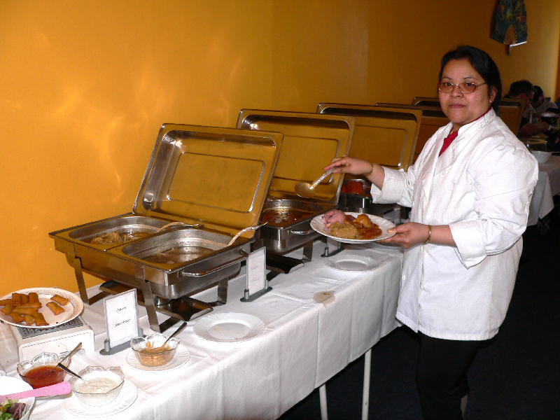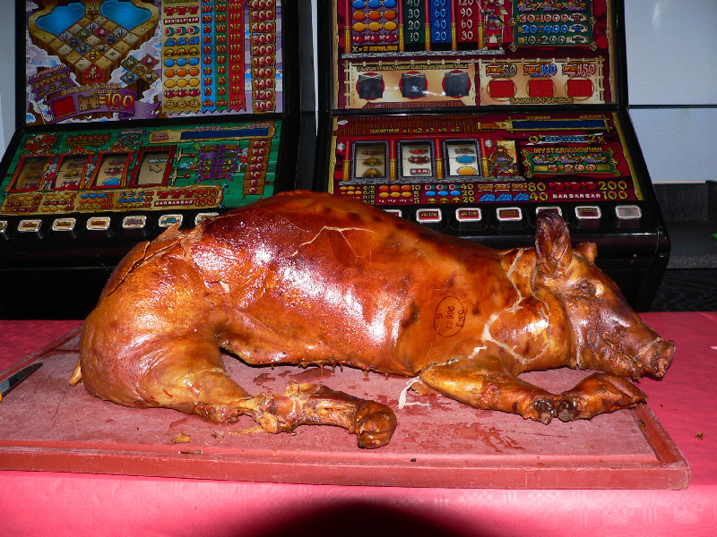 Alle Jahre wieder - pünktlich am 1. März - kann man es bestaunen und genießen: Ein 20 kg schweres, knusprig gebackenes Spanferkel vom Neuköllner Fleischer GLEICH. Immer wieder ist das ofenfrisch angelieferte Spanferkel das Highlight des Gratisbuffets für alle Gäste. Chef de cuisine mit Fleischermesser war wieder Helmut. Auch schon traditionell die krachendvolle THAI THEK und die Superstimmung bis in die frühen Morgenstunden. Es hat sich schon herumgesprochen: Tum's Geburtstagsparty ist ein Ereignis, das man nicht verpassen sollte und durchaus zur Nachahmung zu empfehlen ist. Schade nur, dass Tum nicht jeden Monat Geburtstag hat!!! H.M.