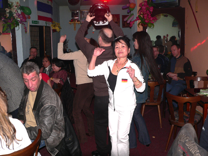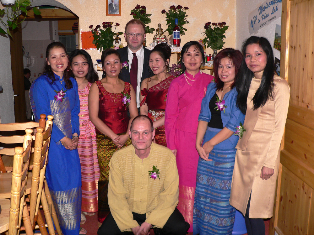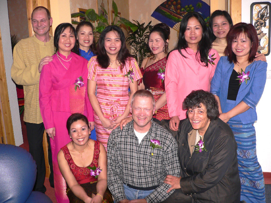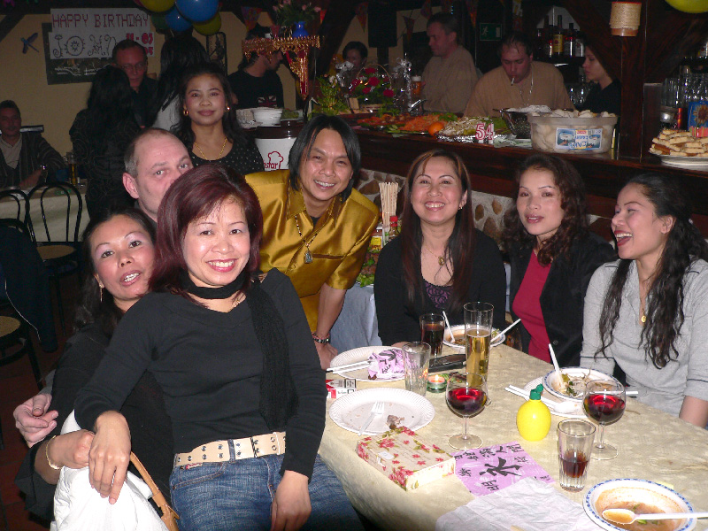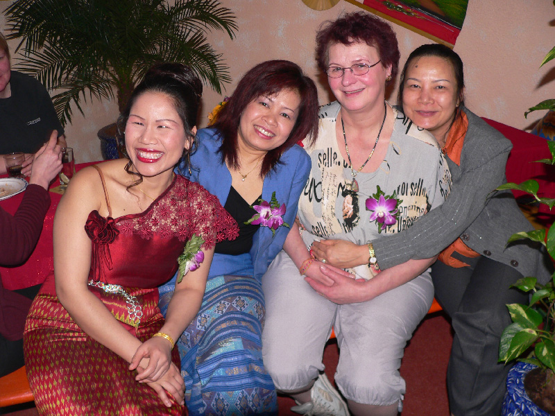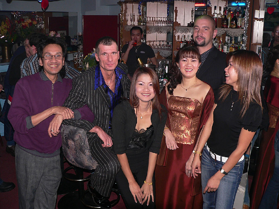 Suleiman - das ist Süle, der muntere Chef vom bewegten Mex Class Thai im Berliner Wedding. Auf dem großen Foto rechts sieht man den Glücklichen an der Seite seiner Nang inmitten einer Schar netter und zumeist Thai-Frauen. So hat er es gerne. Nun, zu seinem Geburtstag gab es am 4. März eine recht flotte Sause. Und viele Freunde und Stammgäste hatten sich eingestellt: Deng von Sunshine Inn, Thai-Fredy, Noi, Thong, Tanzmaus Tippi & Tochter Nit, Lek & Wan, und sogar Sa & Bernd schauten vorbei. Doch bei all dem ausgelassenen Trubel hatten sich zwei Farangs ganz wichtige Dinge zu sagen: Der eine ist Wisey vom Starflights-Reisebüro und der andere der Autor dieser Zeilen. M.H.