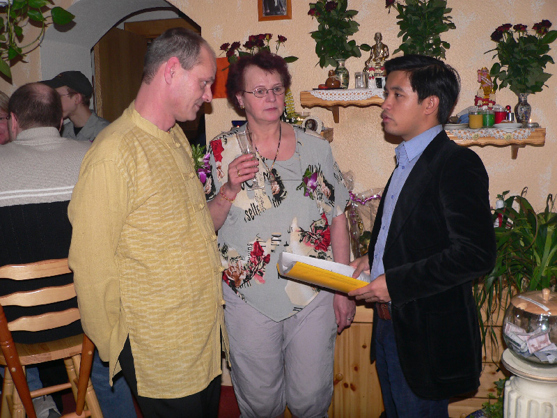 Am 16. März feierte die Berliner Thaimassage DJANTSCHAI ihr Einjähriges. Dazu hatten Nalee und Ronald viele Gäste, Freunde und Stammkunden eingeladen. DJ John sorgte für die Thai-Musik im Hintergrund. Ein Super-Buffet sowie Sekt und Selters verwöhnten die Gäste. Mit Joel Cruz von Bündnis 90/Die Grünen war auch ein Politiker anwesend (Cruz macht sich in Berlin stark für asiatische Unternehmen). Er informierte sich über die von DJANTSCHAI mitinitiierte Aktionswoche für Waisenkinder in Khao Lak. Das Geld geht an ein Projekt für die ?Satree Phuket School?, in der 10 namentlich bekannte Waisen über Jahre finanziell unterstützt werden. Vor Ort sorgen der bekannte Fotograf Wim Cox und Gerhard Engelking (Ex-Goethe-Institut-Chef in Kuala Lumpur), dass es mit rechten Dingen zugeht. Regina und John haben ihre eigene Spendenaktion dort mit angegliedert.