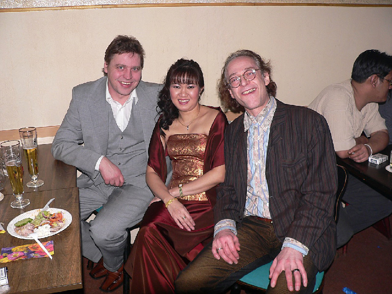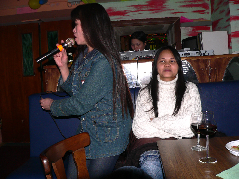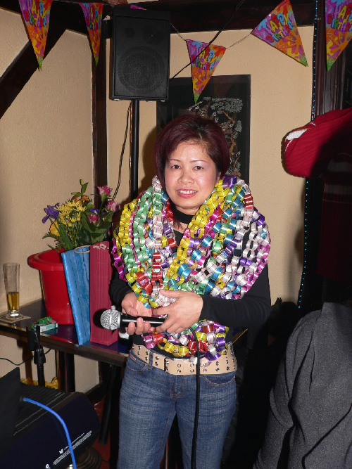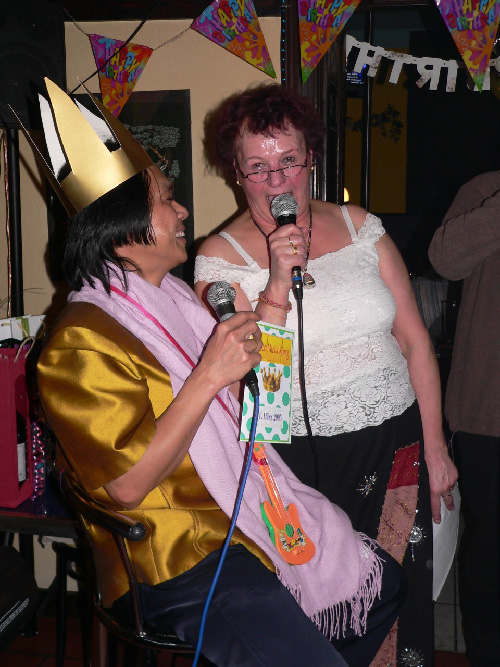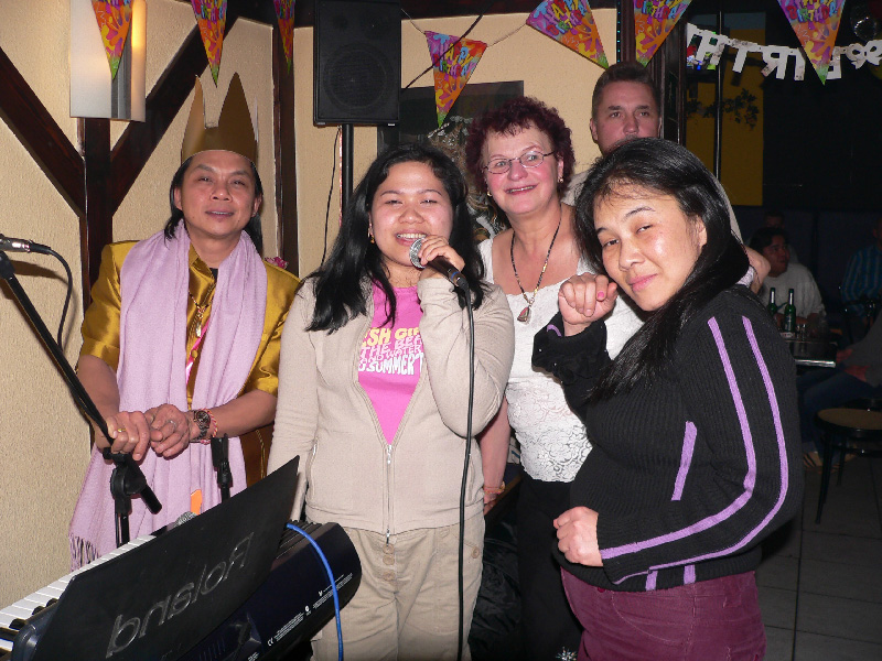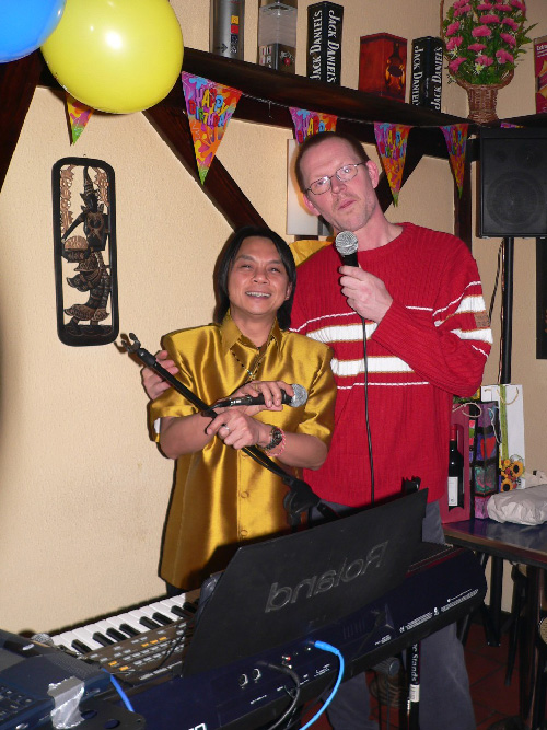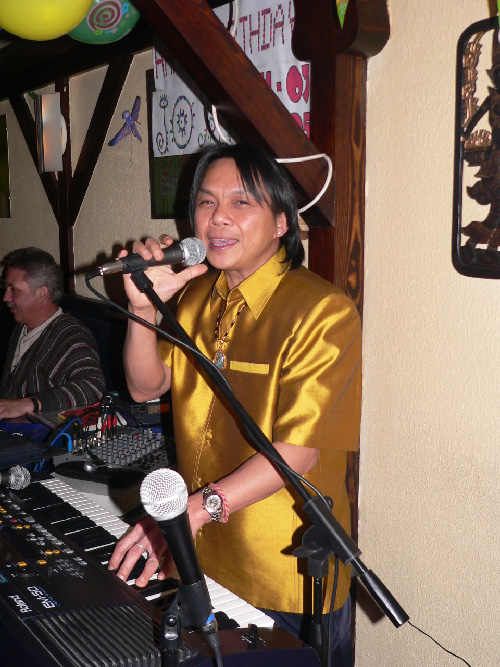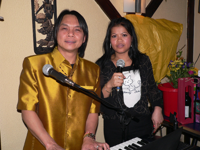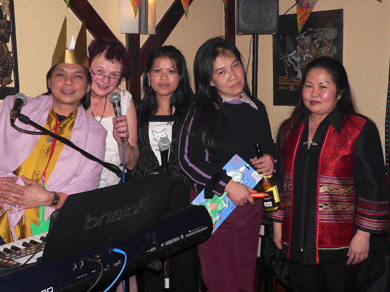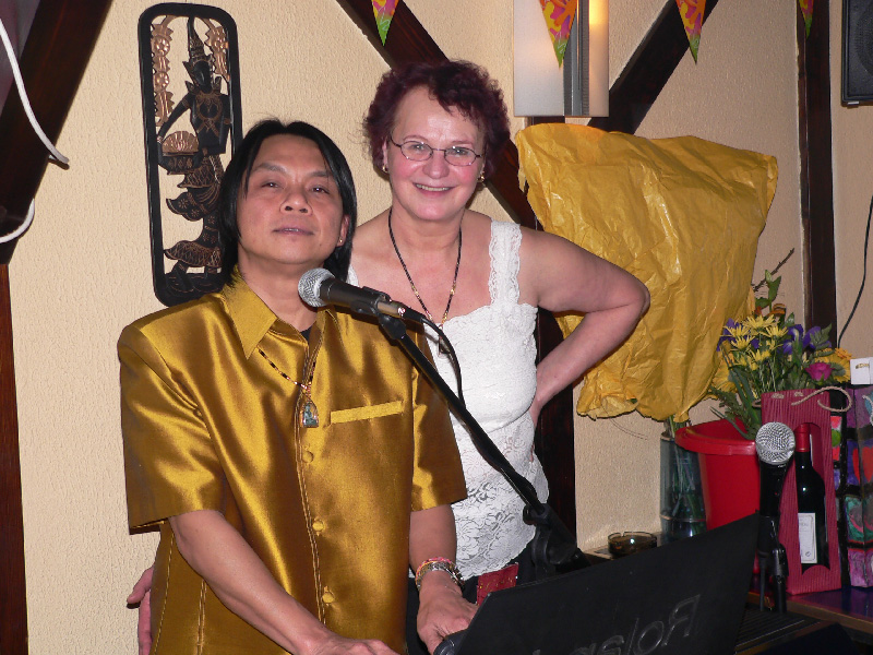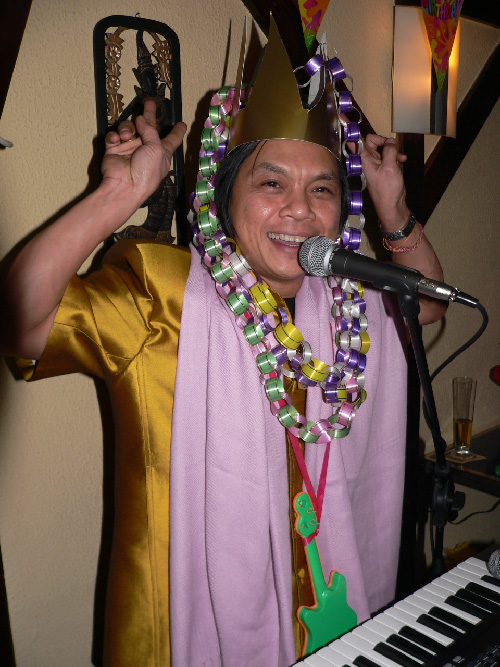 Also, während John am Keyboard für den richtigen Thai-Sound und die Karaoke-Begleitung sorgte, hatte Regina das Heft respektive das Mikro in die Hand genommen. Da gab es einen kurzweiligen Karaoke-Wettstreit mit Phungmalais nebst Gewinnen, dann die Verlosung. Ein Teil der Erträge des Abends geht übrigens als Spende an Waisenkinder in Khao Lak (150 Euro). Aber es gab auch einige Ansprachen. Nun ist es wirklich schwierig, das rechte Maß beizubehalten, zumal wenn der Abend immer später wird und der Pegel in mehrfacher Hinsicht angestiegen ist. Ein Hauch von Karneval kam auf, als Regina John auf einen Barhocker Platz nehmen ließ und dessen Vorzüge wie bei einer Büttenrede auflistete. Und am Ende kam es noch bunter: Regina legte John einen Umhang um, setzte ihm eine goldene Krone aus Pappe auf und schlug ihn mit einer großen Rolle zum König aller Thai-Musiker Berlins. Das war schon äußerst komisch. Der Abend war also recht bunt. John ertrug das Spektakel mit stoischer Ruhe. Es weiß, dass er ein guter Musiker ist und drängelt sich mitnichten in den Vordergrund. Er weiß auch, dass alle seine Freunde ihn auch deshalb achten und schätzen. Alles Gute, old fellow! M.H.