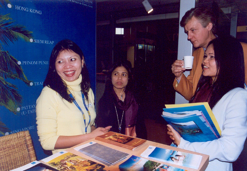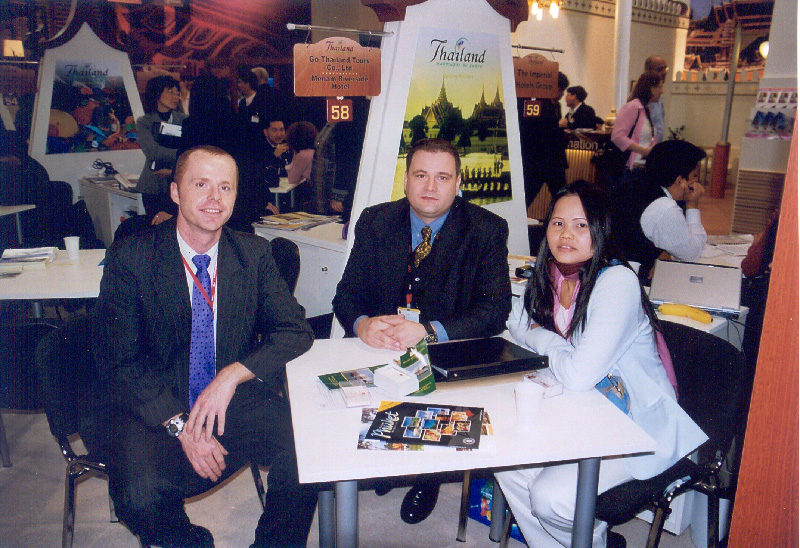 Wie im vergangenen Jahr begleitete der FARANG das Berliner Reisebüro TAR auf seiner Tour über die ITB, die vom 11. bis 15. März unter dem Funkturm stattfand. Neben Besuchen der Stände von spezieller Buchungs-Software standen vor allem Fluggesellschaften und Hotels in Thailand auf dem Tages-Programm. So ging es herzlich bei Bangkok Airways, bei der FINNAIR, bei AUSTRIAN, den Turkish Airlines und bei der EVA zu. Schließlich kennt man sich schon lange und arbeitet gut zuammen. Und für Sa, Ning, Manuela, Bernd sowie für TAR-Chef Torsten Witt ist es wichtig, die News aus erster Hand zu erfahren. Hauptanlaufstelle war natürlich wieder die Asien-Halle 26, wo das Thailändische Fremdenverkehrsamt (TAT) und Thai Airways (THAI) große Pavillone aufgebaut hatten. Thailand warb mit dem neuen Slogan: Thailand Happyness on Earth für das Wiederaufleben des Tourismus nach dem Tsunami. Wichtig für alle FARANG-Leser: Gleich vor Ort spendierten Torsten Behrendt von GO-Thailand-Tours und René Pisters vom Thai Garden Resort die Preise für die Gewinner der diesjährigen Leser-Aktion Wahl der Miss FARANG 2004: Mehrere Hotel- Übernachtungen.
