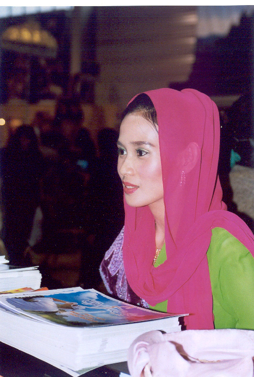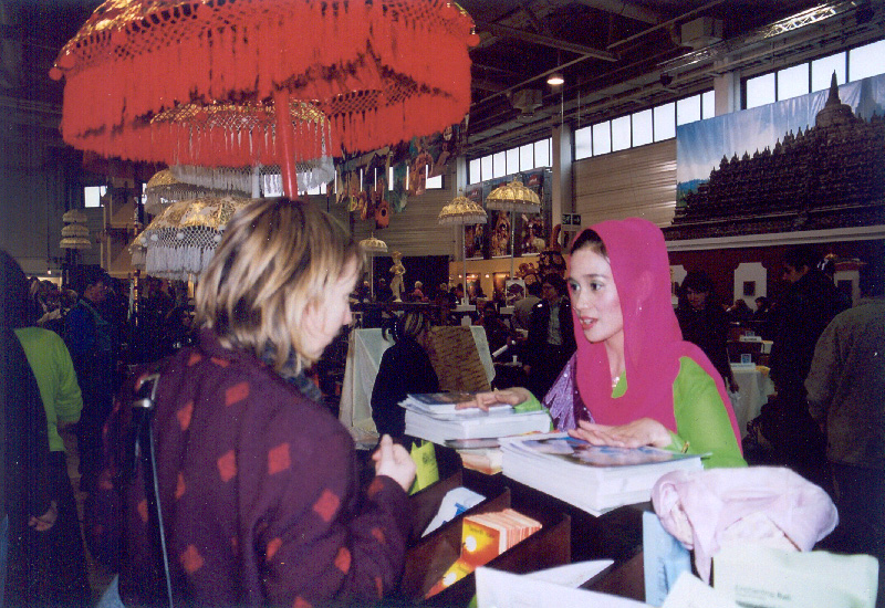 Eine Schönheit mit Schleier berät eine ITB-Besucherin über Reiseziele in Indonesien.