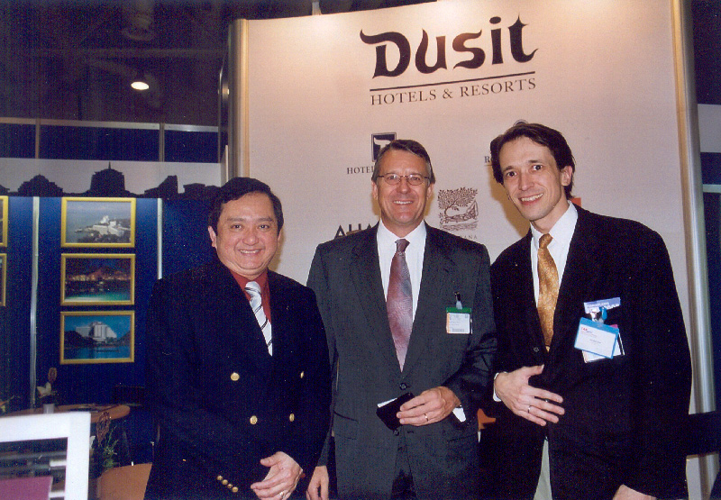Freundlicher Empfang auf der ITB bei der thailändischen DUSIT-Gruppe: Keith D. Blott, Vice President Marketing & Sales (mitte), Phanjawat Bhatayanond (besser bekannt als Khun Panji, links) sowie Torsten Witt vom Berliner Reisebüro Thailand- & Asien-Reisen (TAR).