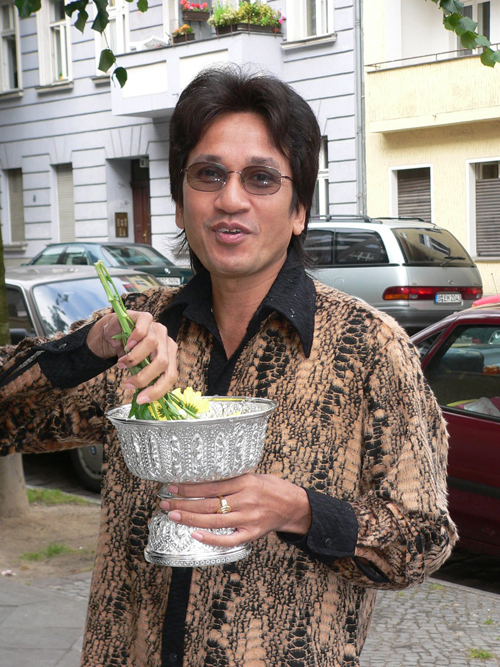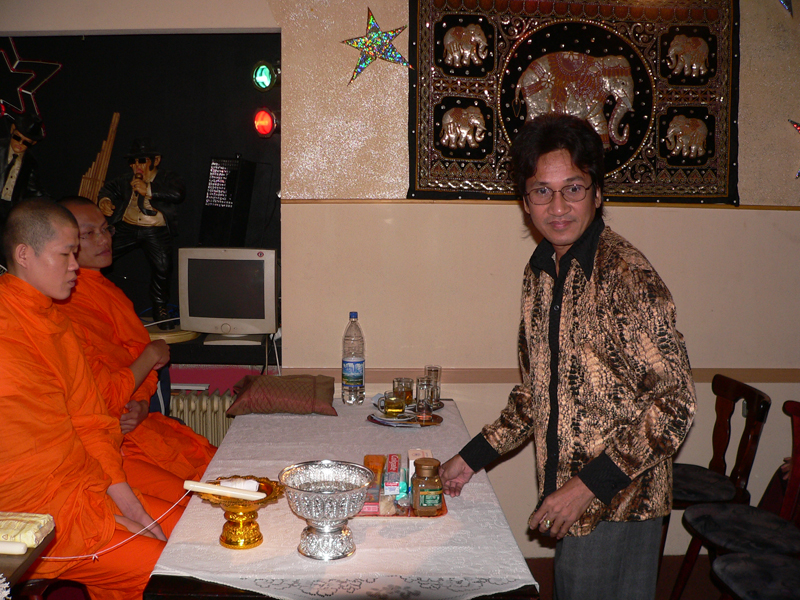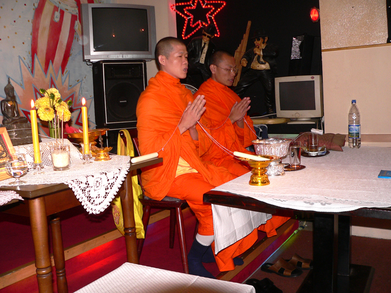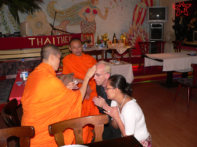 Ein weiteres denkwürdiges Ereignis ergab sich, als zwei sich Liebende vor den Mönchen ein Hochzeitsversprechen abgaben und gleichfalls geweiht wurden. Es handelte sich dabei um Jiraporn (Manee), Chefin des Thai-Bistros Golden Buddha in der Kreuzberger Blücherstraße und um Peter. Eine sehr schöne Geste. Mathias Heinrich