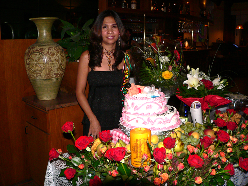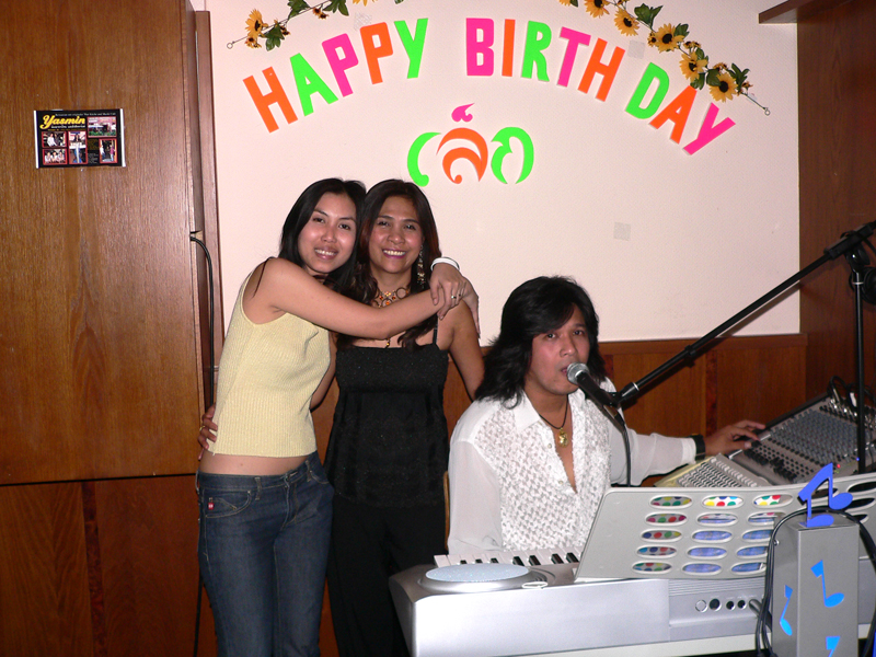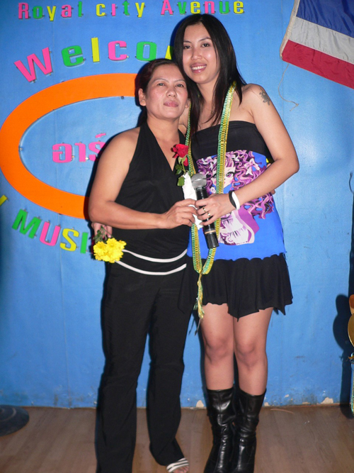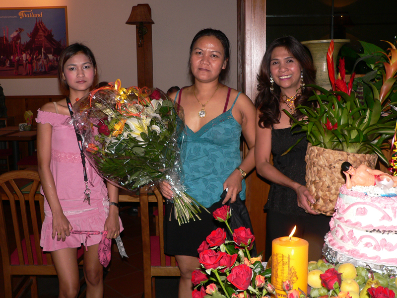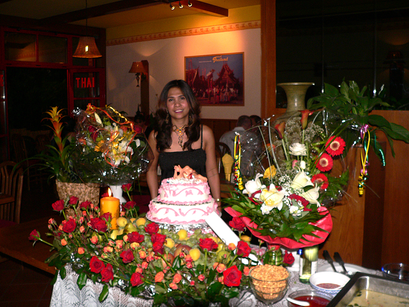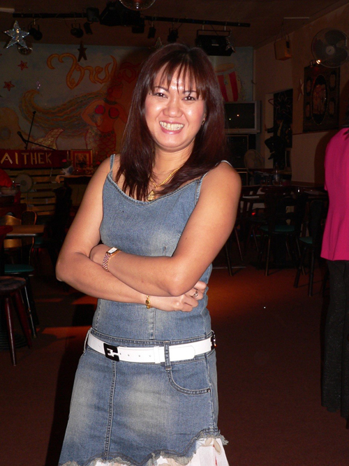 Wenig später hatte Ree eingeladen. Auch ins R.C.A. und auch wegen Happy Birthday. Ree ist sehr freundlich und charmant, wenn man das so sagen darf. Eine zurückhaltende Schönheit. Wenn sie Thai Karaoke singt, dann schlagen so manche Farang Herzen höher. Ree ist übrigens eine der drei erstplatzierten Schönen für die Wahl der Miss Farang 2004 am 17. September. Sie hat dabei gute Chancen, die goldene Krone zu erringen.