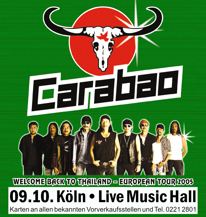 Die Hamburger Agentur Ass-Concerts hat es geschafft, die thailändische Band Carabao zu einer Europa-Tour zu überreden. Unter dem Titel Welcome Back To Thailand - European Tour 2005 touren sie durch halb Europa. Am 11.10. treten sie in Berlin-Neukölln, in Huxleys Neuer Welt, Hasenheide 108, auf. Einlass 20 Uhr, Beginn 21 Uhr. Die Karte kostet im Vorverkauf, bei www.kartenhaus.de, 34 Euro. Tickets gibt es auch telefonisch Tel. 040 - 43 30 39 und Tel. 030 - 780 990 10.