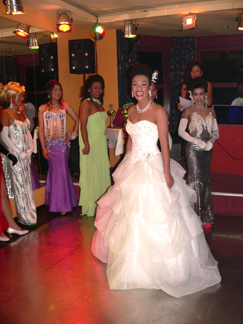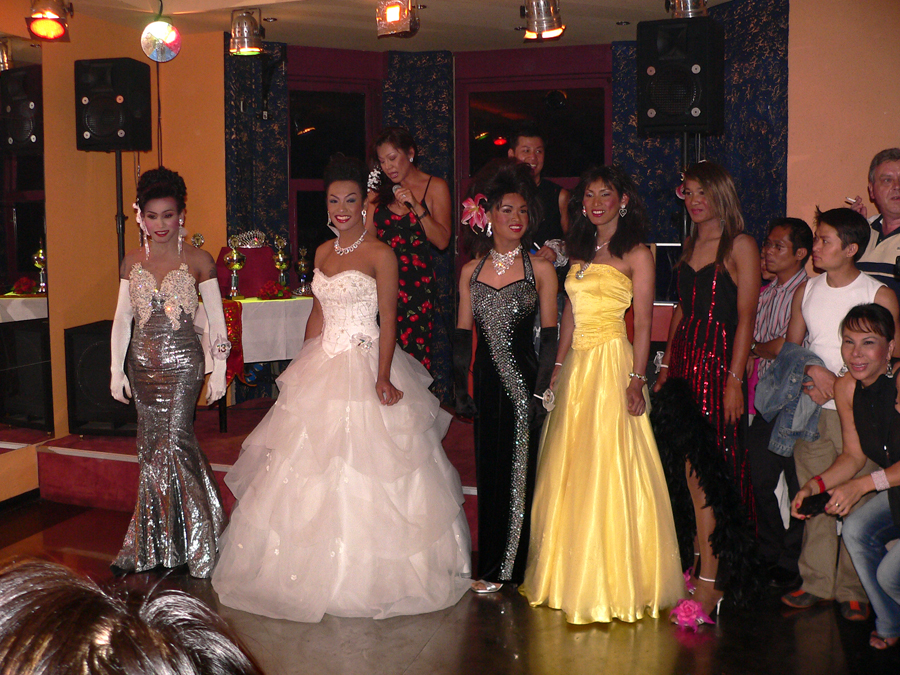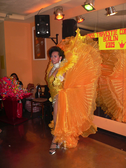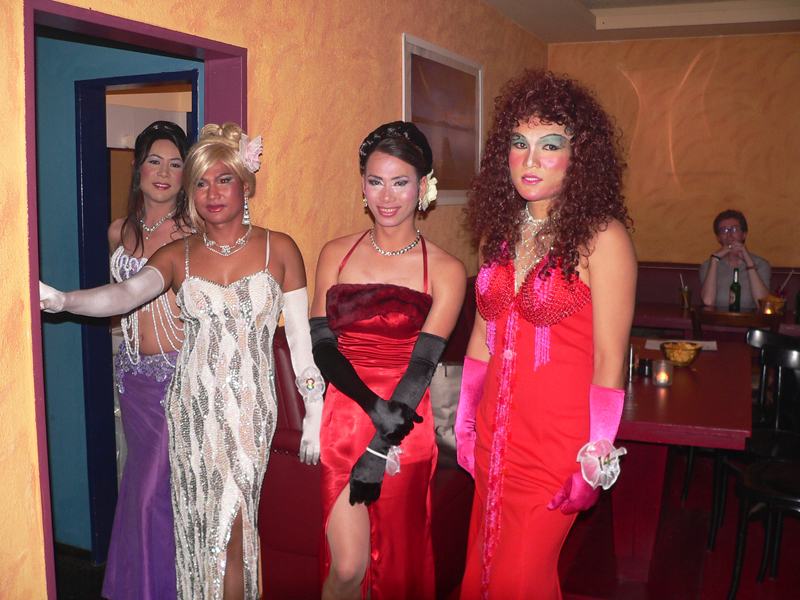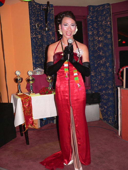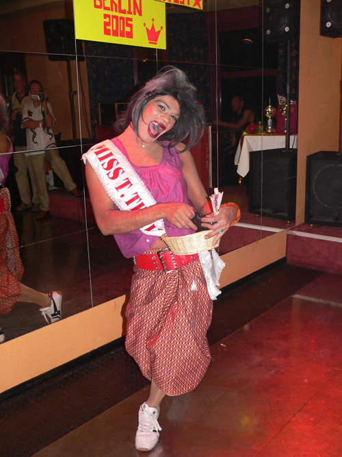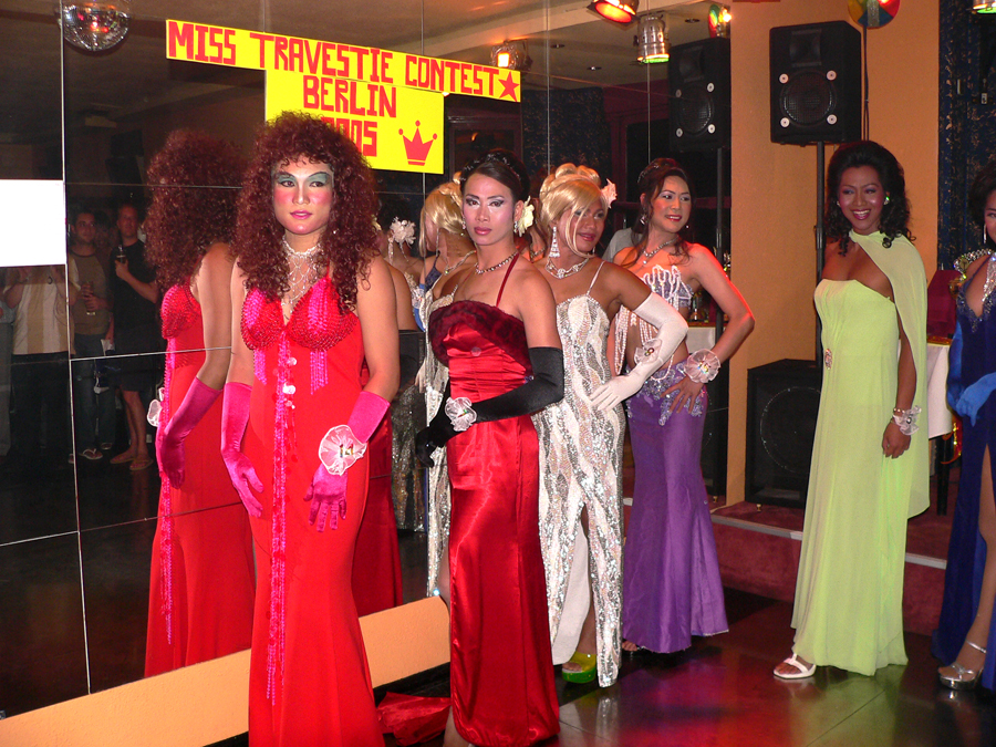 Dies war ja nicht die erste Asia Night, die von DJ Geng, Jump und Thong in Berlin veranstaltet wurde. Es war aber mit Sicherheit die schrillste. Alles drehte sich am 30. Juli um die Wahl der Miss TRAVESTIE. Also hatten sich 11 Schöne erstklassig zurecht gemacht und mussten mehrere Runden vor der gestrengen Jury absolvieren. Zur Jury gehörten keine Geringeren als Edd, Bancha und Em On vom gleichnamigen Thai-Restaurant auf der Kantstraße. Das zahlreiche Publikum, das den Weg in die Kleiststraße 35 nahe dem Nollendorfplatz fand, amüsierte sich prächtig und filmte und fotografierte, was das Zeug hielt. Da es auch von den Temperaturen richtig heiss herging, kam unser Fotograf so ins Schwitzen und bekam Atemnot. Aus diesem Grund haben wir die letztendliche Krönung der Miss TRAVESTIE nicht mehr erlebt. Die kleine Disco war wie eine Sauna. Da halfen auch nicht die schrägen Comedy-Nummern zwischendurch. Draußen im Kühlen saß ganz entspannt der Werner, hingegen drinnen quirlte Sarod. Vielleicht können sich die talentierten Veranstalter eine geeignetere und größere Location suchen. Es soll schließlich weitergehen mit der monatlichen Asia Night. Mathias Heinrich