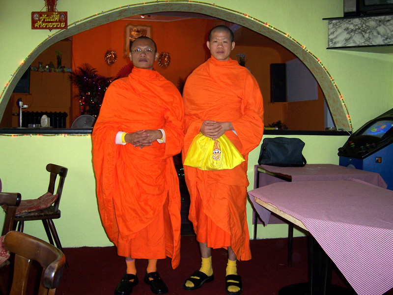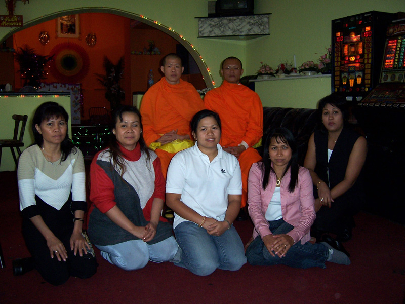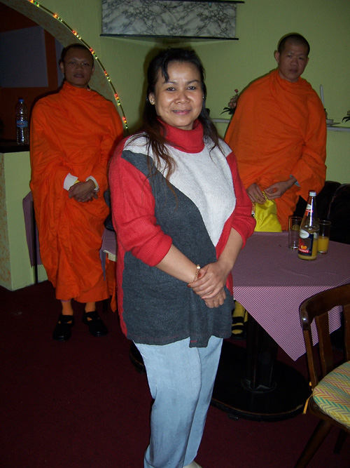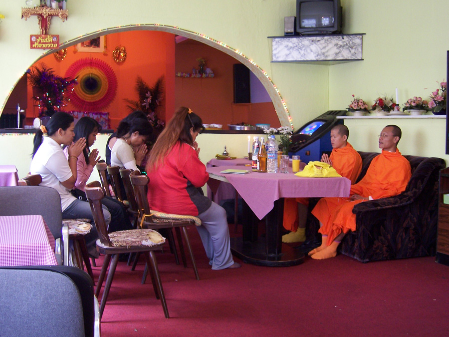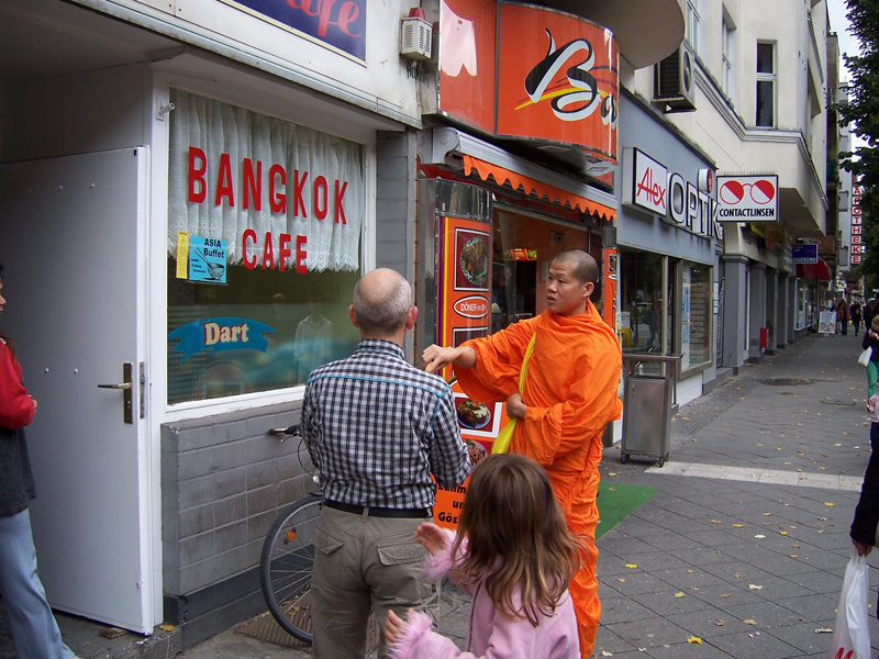 Nur ganz wenige haben es gewusst: Am Morgen des 30. September fanden sich im Bangkok Café an der Sonnenallee 132 zwei Mönche ein und sorgten auf ihre Weise dafür, dass Dias Geschäfte auch in Zukunft mit Erfolg weiterlaufen. Tage zuvor wurde das bekannte Neuköllner Thai-Geschäft frisch renoviert. So konnte die buddhistische Zeremonie in einem ansprechenden Rahmen ablaufen. Erst gemeinsames Beten, dann essen die Mönche, und am Ende wird geweihtes Wasser in alle Winkel des Lokals verspritzt. Der Anlass für diese Zeremonie: Das Bangkok Café wurde neun Jahre alt.
