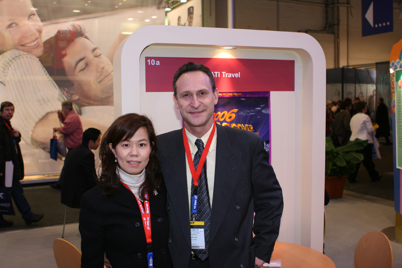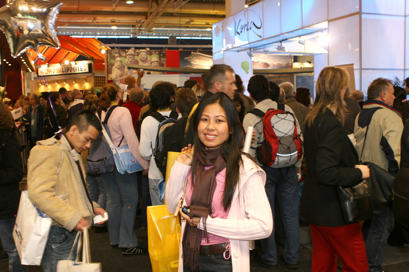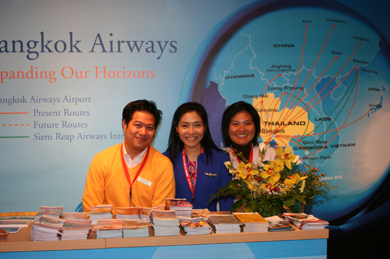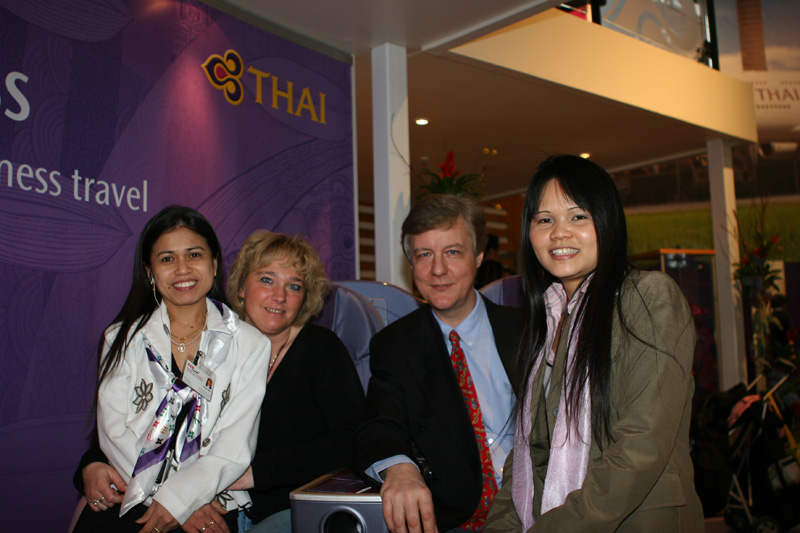 Das kleine FARANG-Team schloss sich dem schon traditionellen Rundgang des Reisebüros TAR (Thailand- & Asien Reisen) von der Berliner Kantstraße an. Mit Sa und Bernd, Ning und Manuela ging es zuerst ins Pressezentrum, dann zu den Ständen von der Airlines EVA Air (mit neuer Business Class für Wien-Bangkok), zur Finnair, zur Austrian und dann natürlich weiter in die Thailand-Halle 26. Dort waren Bangkok Airways und die THAI die ersten Ziele. Schließlich möchte man die Kontakte zu den Gesellschaften vertiefen und auch gutes Informationsmaterial für die eigenen Kunden besorgen. Die THAI fliegt non-stop ab 29. Oktober mit dem neuen Airbus A 340/600 von München nach Bangkok, wobei in der Economy jeder seinen eigenen Bildschirm hat. Viele Aussteller hatten immer mehr multimediales Werbematerial im Angebot: Foto-CDs und Internet- und Power Point Präsentationen. Am besten gefiel dem Autor die flash-animierte CD von Bangkok Airways, die richtig Spass machte und das Attribut multimedial wirklich verdiente.