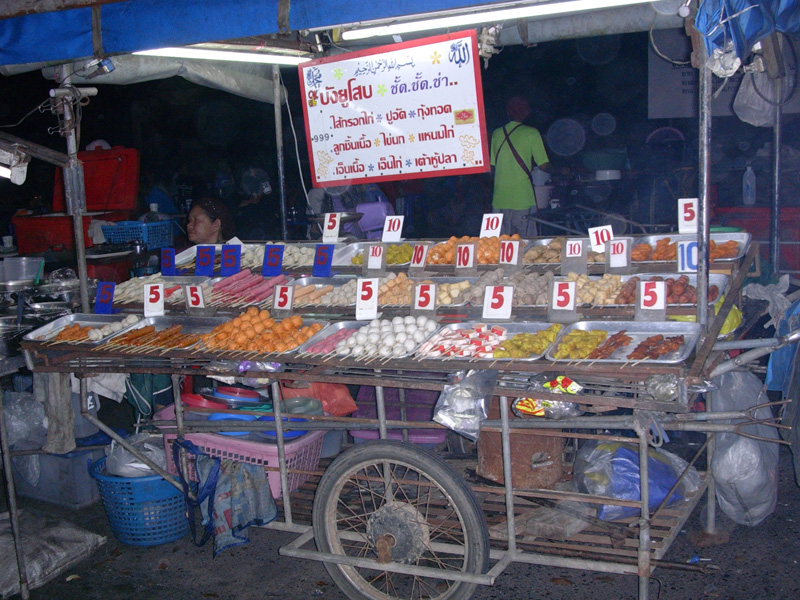 Der im Reiseführer angepriesene Nachtessensmarkt in der Montri Road wirkt auf uns eher kläglich. Wir treffen auf sehr wenige Farangs; doch das macht den Reiz der Stadt aus: Hier sind wir die Attraktion und werden mit neugierigen Blicken bedacht. Nur die Verständigung ist, wie bereits erwähnt, ein Problem und da helfen uns die paar Thaiwörter und -sätze auch nicht viel. Trotzdem ist es lustig, die Reaktionen der Einheimischen zu beobachten, wenn wir "Hong nahm yu tiennai?" oder "Check bin" sagen - meist ruft es ein Lächeln auf die Gesichter der Thais hervor.