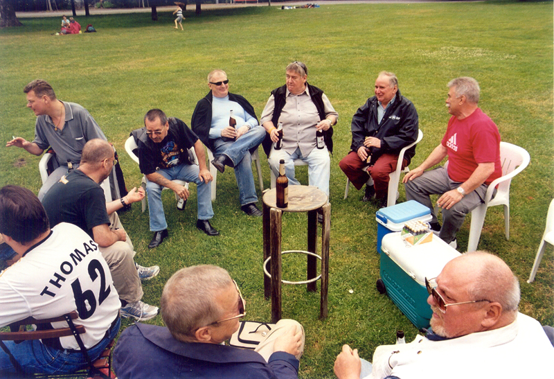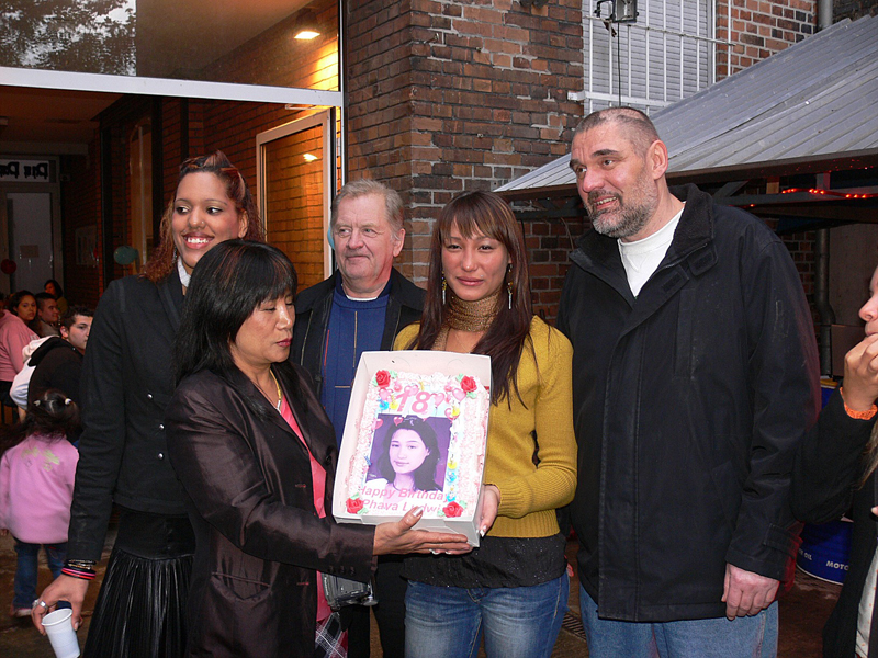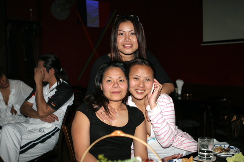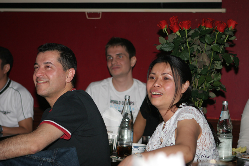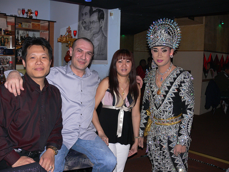 Dias Geburtstag fand an jenem Tage statt, als uns Germany knapp aber erfolgreich gegen Polen fußballerte. So war denn das New Bangkok Café am Kreuzberger Mehringdamm auch richtig voll, und sogar draussen auf der kleinen Terrasse saß man ordentlich. In zwei Räumen TV live und eine prächtige Stimmung. Viele Thaifrauen schrien und jubelten für Deutschland. Aber das Beste an der Party war das sehr üppige Buffet. Sage und schreibe 16 Thai-Gerichte von guter Qualität und in professionellem Gastro-Metall dargeboten. Dieter trollte sich in den Keller, um neue Fässer anzuschliessen. Und Porn sorgte für flüssigen Nachschub. Oliver kam mit der Harley, und Bancha-Tochter Sue (18) lächelte jeden Gast sehr nett an. Es wird ja immer besser. Bald soll ja auch das billige Plastik-Besteck verschwinden. Nach dem Fußball dann gab es mehrere Thai-Tänze von Baan Mai Ruh Roy in klassischen Kostümen. Ein echter Hingucker auch für die vielen Passanten, die schon mal einen Blick durch die Schaufensterscheiben wagten. Demnächst ist ja die neue Außenwerbung fertig. Dann kommt noch ein großer Bildschirm für die Karaoke und fertig. Das gratis Buffet an den Tagen Mittwoch und Freitag ist nun nicht mehr ganz umsonst. Es kostet jetzt 2,50 Euro, und das dient sozusagen als eine Schutzgebühr gegen die schottischen Teetrinker. Ist auch richtig so. Neu in der Karte sind Stulle mit Brot, wie die Berliner sagen. Also Käse-, Schinken-und Wurst-Brote zu kleinen Preisen. Gut zum Frühstück für die Spätaufsteher. Immer sonntags ist nun Ladys-Day: Die Girls brauchen jedes zweite Getränk nicht bezahlen. Und Punkt.