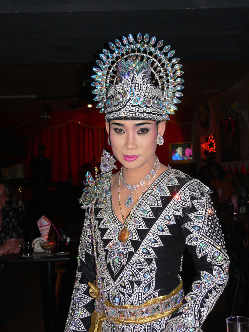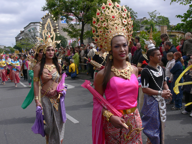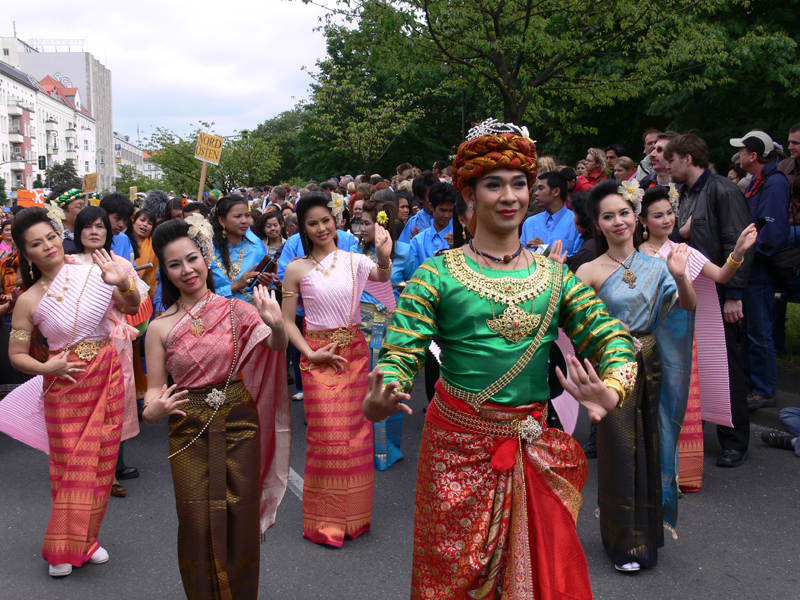 Im langen Zug der Thailänder waren auch viele bemerkenswert gekleidete Kathoyes. Beispielsweise als zwei mondäne Damen mit Hut in dem Samlor. Das kam gut an. Dann mehrere Gruppen in typischen Trachten aus den verschiedenen Regionen Thailands. Eine eigens aus Thailand eingeflogene Kulturgruppe von der Burapha Universität bildete den Kern der Tanzgruppe.