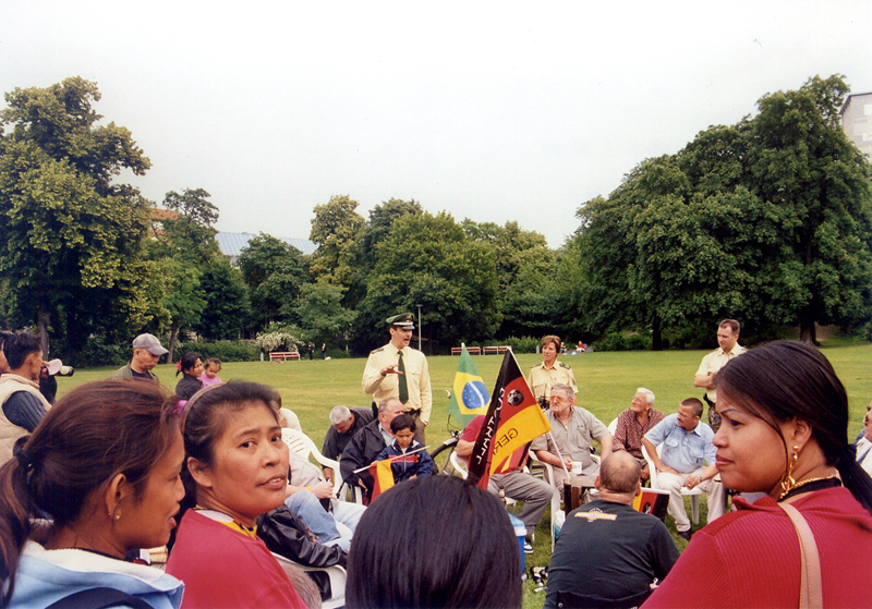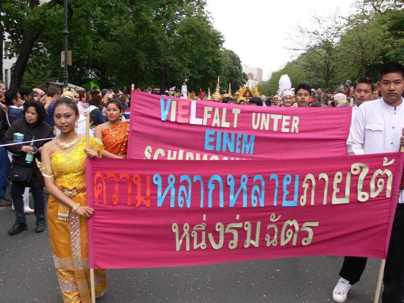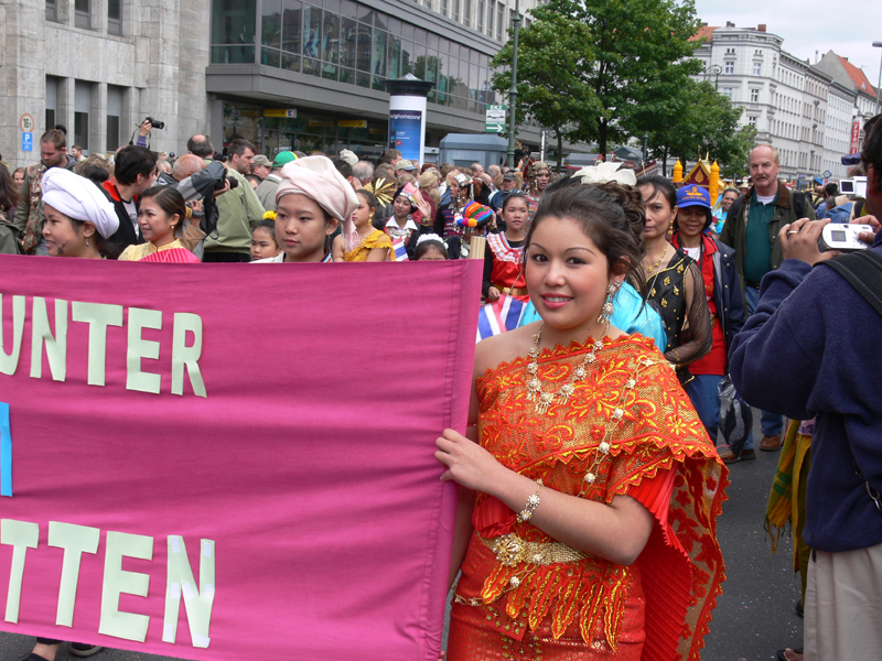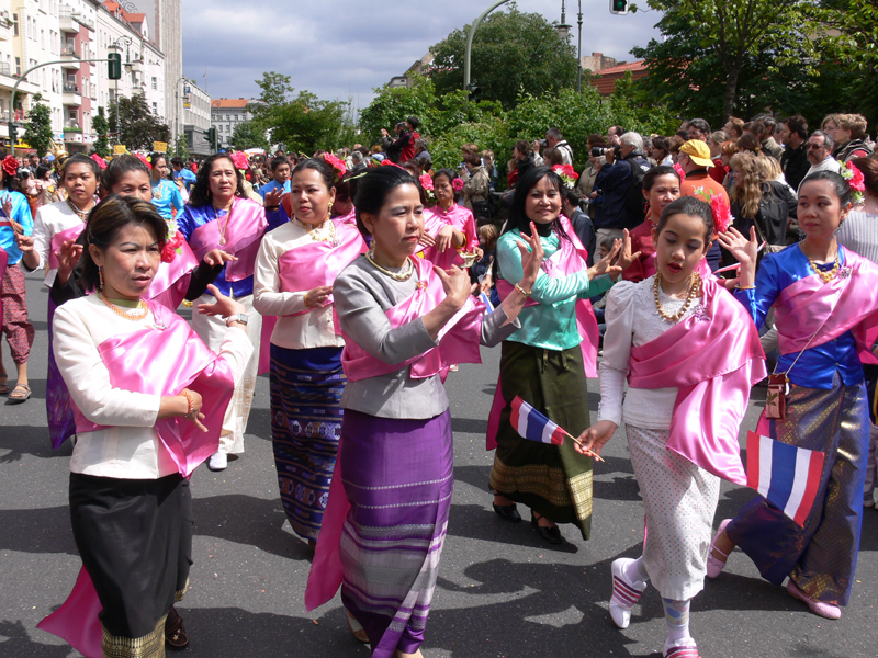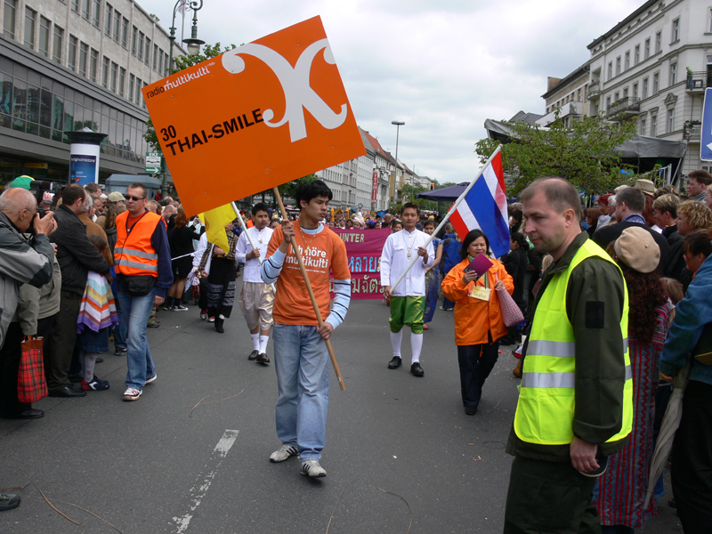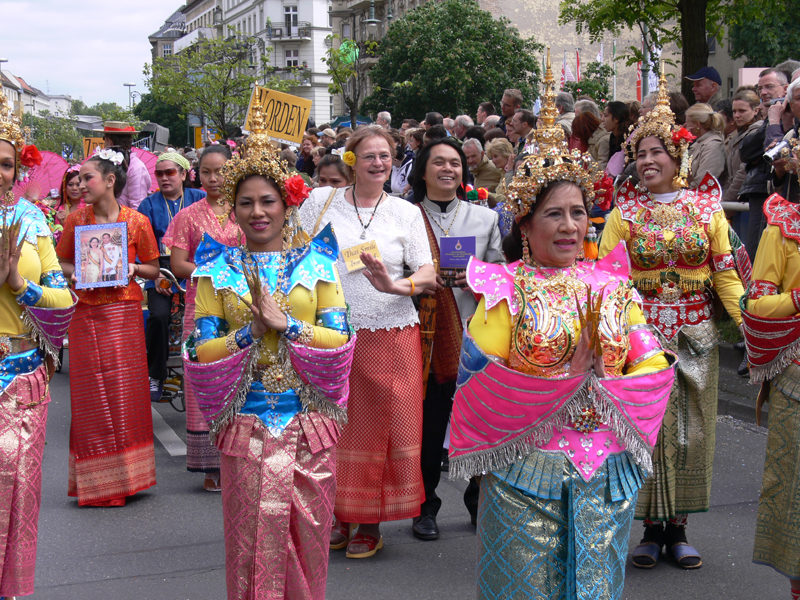 Resümee: Das viele Laufen war für die Thailänderinnen sicher sehr anstrengend. Dazu noch in den schmalen silbernen und goldenen Tanz-Schuhen. Aber, es war ein sympathischer Patriotismus und eine besondere Ehrung für ihren König. Auch die lokale Presse war voll des Lobes über diese neue Farbe beim traditionellen Karneval der Kulturen in Berlin. Mathias Heinrich