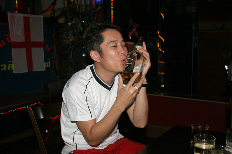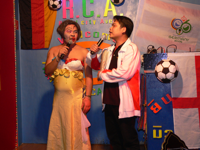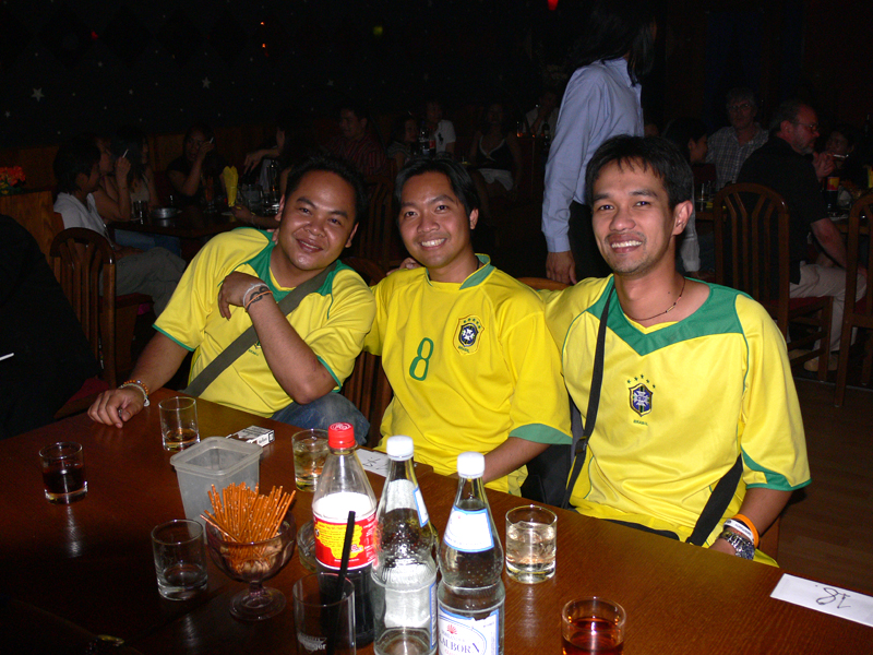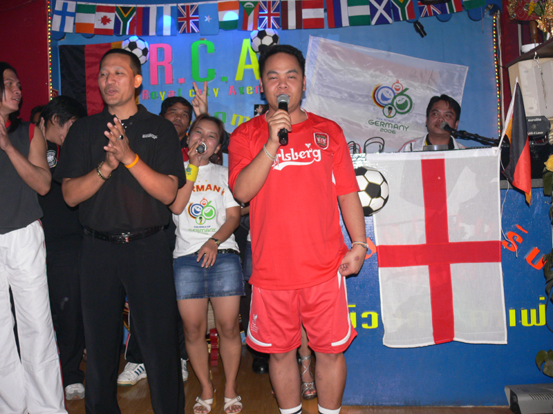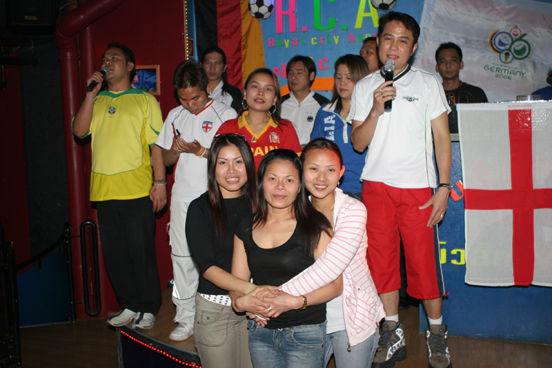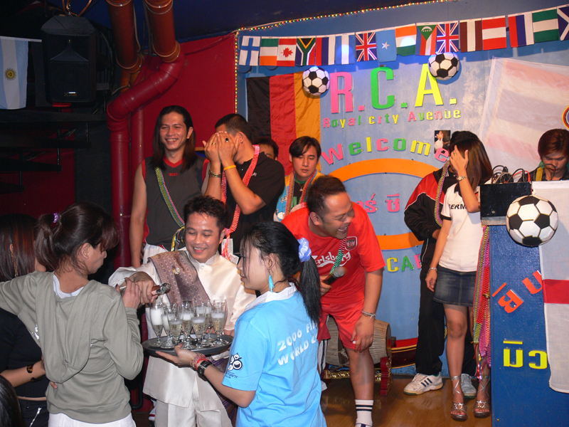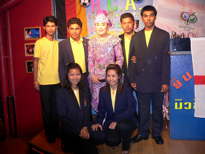Tage später feierte unser Bärchen, den wir im kleinen Foto seinen Chef durchs Quartier schieben sehen. Beide sind immer zu einem Spaß bereit und treiben allerlei Schabernack und Mummenschanz. So soll es ja sein. Bärchen gehört zu jenen Darstellern mit den witzigsten Maskierungen. Das kommt gut an bei den Thai-Frauen. Lachen aus vollem Herzen und hier und da auch mal ein derber Gag. Während der WM war das R.C.A. voll auf Fußball gestylt. Alle im Trikot, auch eine Idee von Toi.