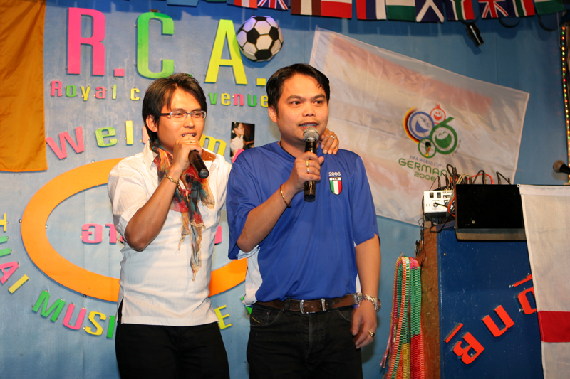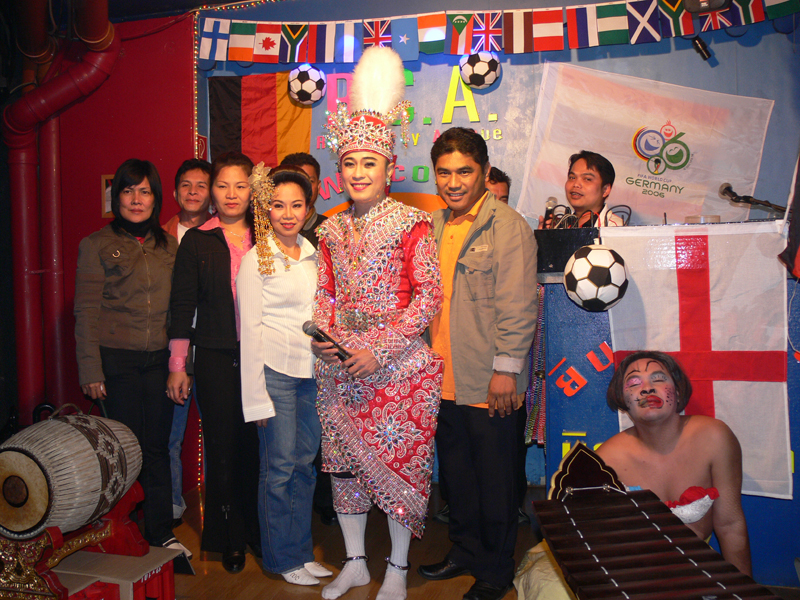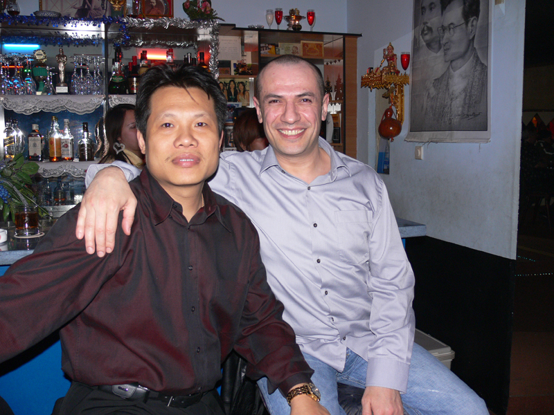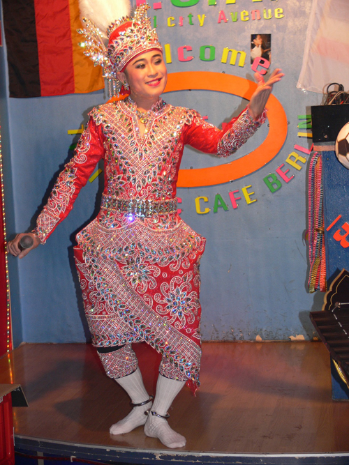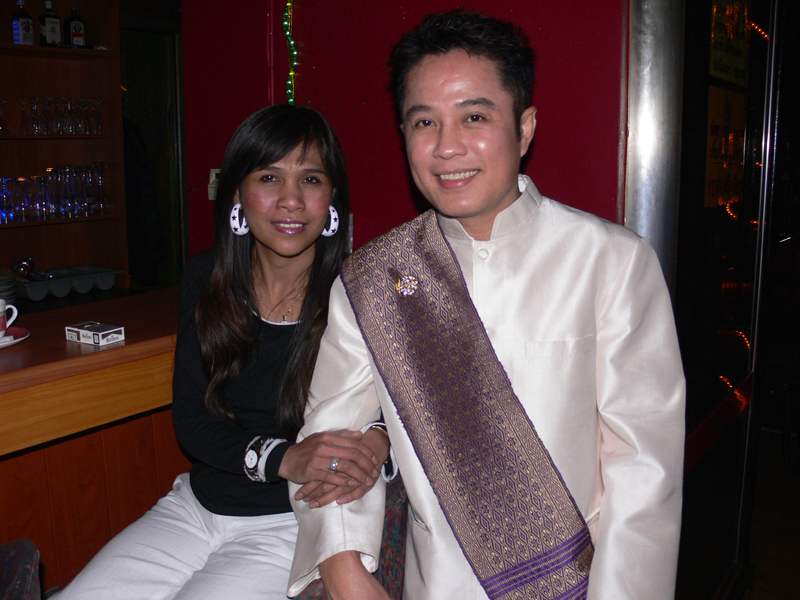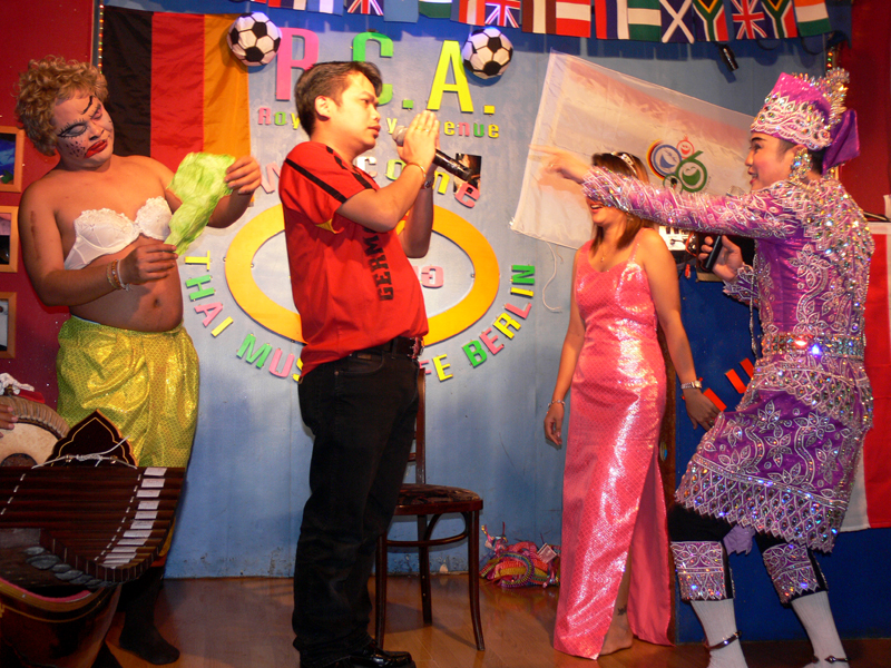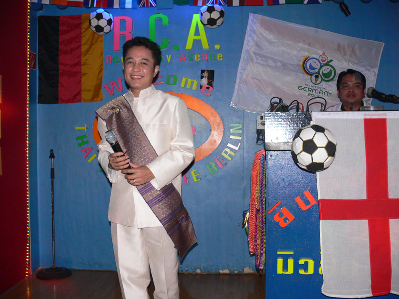 Die beste Thai-Comedy in Berlin gibt es im Neuköllner R.C.A. Dafür verantwortlich zeichnet Toi, der Manager und Chef-Sänger. Seinen Geburtstag feierte Toi am 2. Juni denn auch zünftig und bunt. Mit gratis Thai-Buffet für alle Gäste und einem engagierten Tanz-Duo mit thailändischer Instrumental-Musik. Toi kam zuerst in einem schneeweißen Seiden-Anzug mit Schärpe, dann spät in der Nacht in seinem neuen rotfarbenen Kostüm. Dieses hatte er gerade von seinem Thailand-Urlaub mitgebracht.