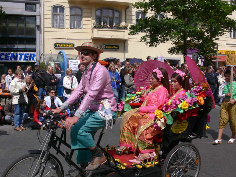 Der Karneval der Kulturen ist das multikulturelle Groß-Ereignis in der Hauptstadt. Er findet bereits das elfte Mal statt. Höhepunkt der mehrtägigen Straßenfeste und Veranstaltungen ist der große Straßenumzug von Neukölln nach Kreuzberg. Mehr als 800.000 Zuschauer waren auf den Straßen, etwa 100 Formationen aus 70 Ländern mit weit über 4.000 Aktiven zogen, meist von geschmückten Trucks angeführt, vom Herrmannplatz bis zu den Yorckbrücken. Dieser schrill-bunte und auch fröhlich lärmende Zug dauert von Mittag bis in den Abend. Es wurde laut gesungen, ausgelassen getanzt und die ganze Vielfalt der Welt-Kultur präsentiert. Nicht vergessen: In Berlin leben 440.000 Ausländer. Und der Veranstalter des Events ist die in Neukölln ansässige Werkstatt der Kulturen.