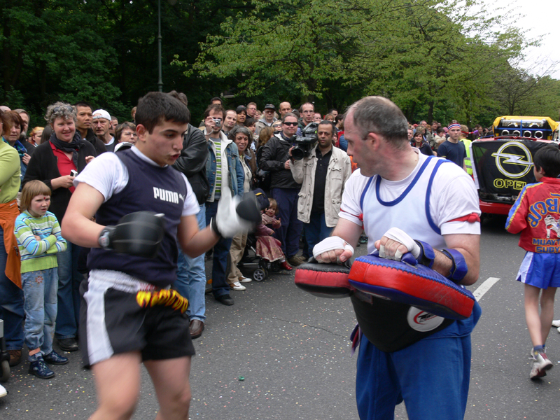 Die Formation bestand aus bestimmt an die 100 Thailänderinnen in ihren auffallenden Kostümen und goldenen Hauben, dann mehrere kleinere Wagen, eine Fahrrad-Rikscha (Samlor) sowie die Muay-Thai-Mannen von Sven Markulla am Ende der Gruppe. Die Thai tanzten, trommelten, lächelten geheimnisvoll asiatisch und machten mit Trommeln und Zimbeln Musik und zeigten Thai-Boxing live. Die erstaunten Zuschauer an den Straßenrändern applaudierten spontan und freuten sich über diesen exclusiven Augenschmaus. Das Wetter hielt zwar, obwohl es gerade mal 16 bis 17 Grad waren. Für Thai aber einfach zu kühl.