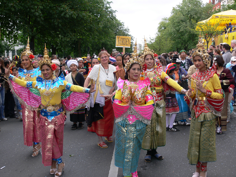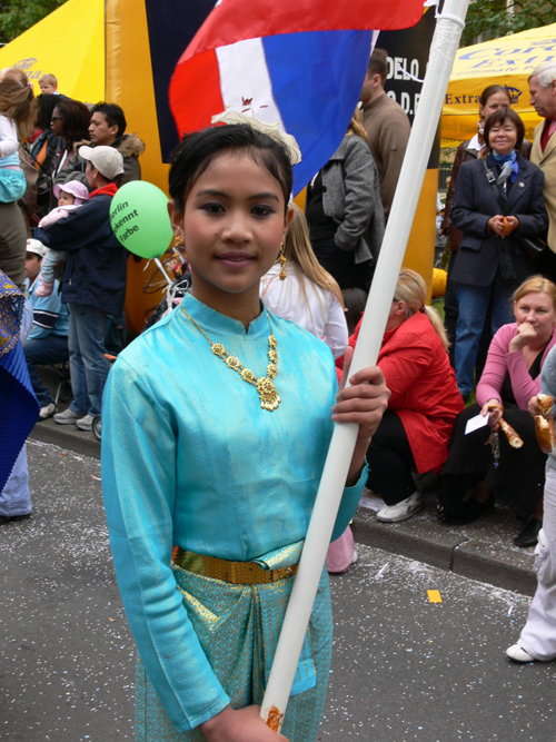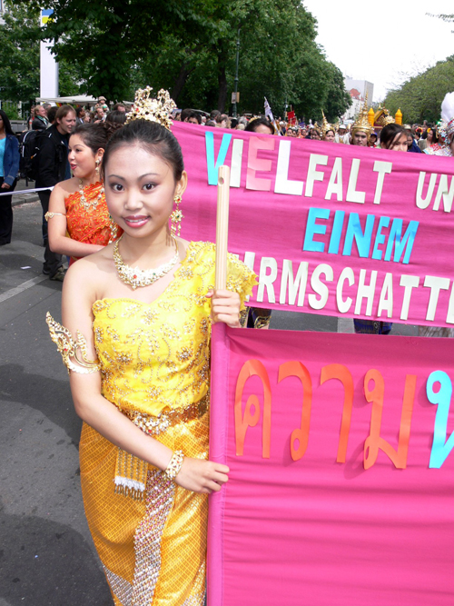 Bisher hatten vor allem brasilianische Samba-Rhythmen das farbenprächtige Bild des Umzugs geprägt. Dazu die vielen Gruppen aus Afrika und ganz Lateinamerika. Jetzt ist eine neue Farbe hinzugekommen. Erstmals nahm Thailand unter dem Motto "Thai-Smile" an dem Umzug teil... Und gewann auch gleich den 1. Platz in den Augen der Jury. Dafür auch unsere Gratulation!